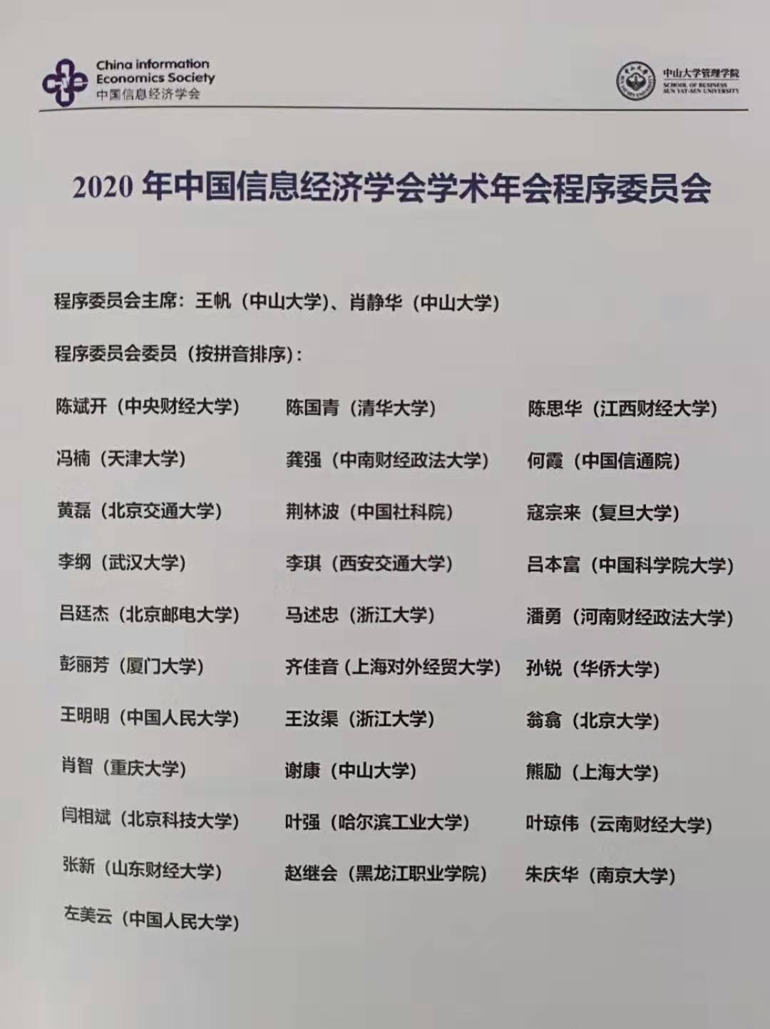 11月28--29日,由中国信息经济学会主办,广州中山大学承办的“2020中国信息经济学会学术年会”隆重举行。学校党委书记赵继会、副校长郑福贵、工商管理学院院长张凤英、信息工程学院院长金忠伟、工商管理学院教授王知强应邀参加会议。