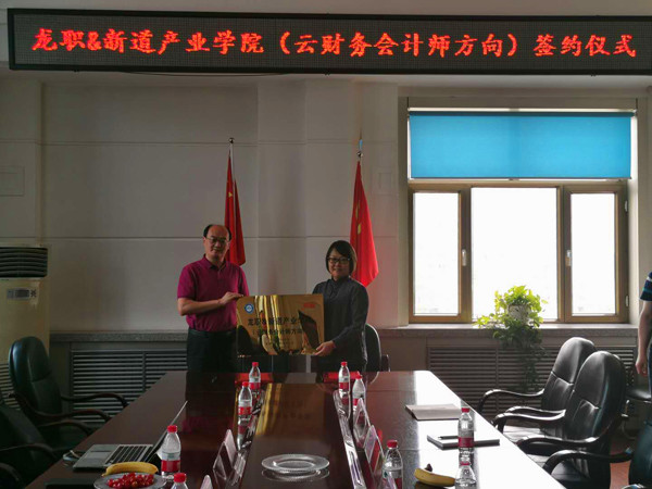 会上,院长在鞠永红介绍学院情况后,郑福贵副校长代表学校致辞。宋健副总裁代表新道科技股份有限公司发言并与学校签订校企合作协议。最后,宋健向鞠永红进行“龙职&新道产业学院(云财务会计师方向)”授牌。