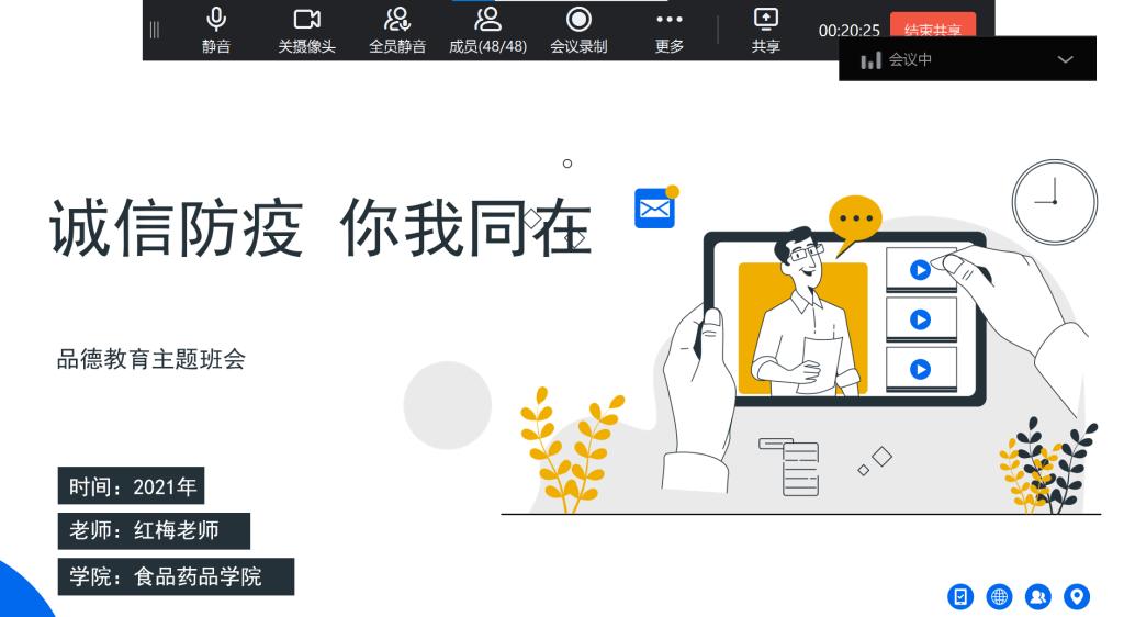 为引导教育学生提升疫情防控主人翁意识的号召,筑牢学生诚信意识,为疫情防控助力。11月4日,学校食品药品学院中药制药2101班通过钉钉视频召开线上“诚信防疫,你我同在”主题班会。