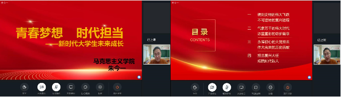 朱今一以《青春梦想 时代担当——新时代大学生的未来成长》为主题,从“镌刻史册的伟大飞跃,不可逆转的复兴进程”“气象万千的伟大时代,浓墨重彩的崭新篇章”“永葆初心的大党担当,伟大光荣的历史贡献”及“担当复兴大任,成就时代新人”四个方面,通过“两个结合”“十个明确”系统梳理了十九届六中全会精神的丰富内涵,回顾总结了党的百年奋斗的光辉历程、伟大成就和宝贵经验,总结了党百年奋斗的历史意义,剖析了目前所面临的形势及新时代青年的责任担当。他希望所有的青年学生都能立大志、明大德、成大才、担大任,为实现中华民族伟大复兴的中国梦而努力奋斗。