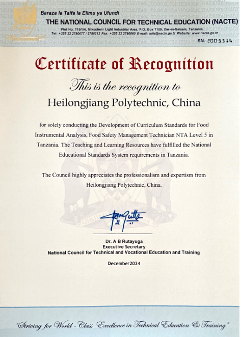 近日,由食品药品学院牵头开发的坦桑尼亚食品安全管理技术员NTA5《食品仪器分析》课程标准通过了坦桑尼亚国家职业教育委员会审核获得认证。