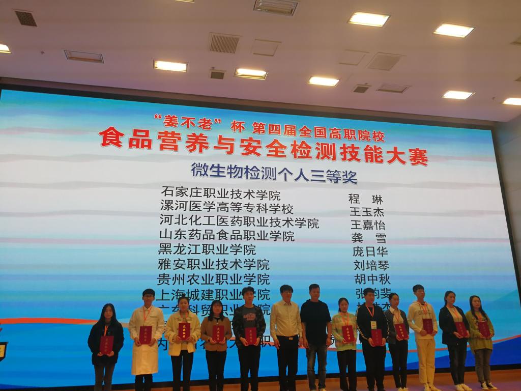 11月14——17日,由全国食品工业职业教育教学指导委员会主办的第四届全国食品营养与安全检测高职院校在校生技能大赛落下帷幕,来自23个省,160位参赛选手,83个代表队参赛,KY开元官网食品药品学院教师陶玉霞、马艳梅指导的学生李玉杰、庞日华分别在营养素检测赛项和微生物检测赛项中获得一等奖和三等奖,KY开元官网综合分数喜获团体总成绩一等奖。