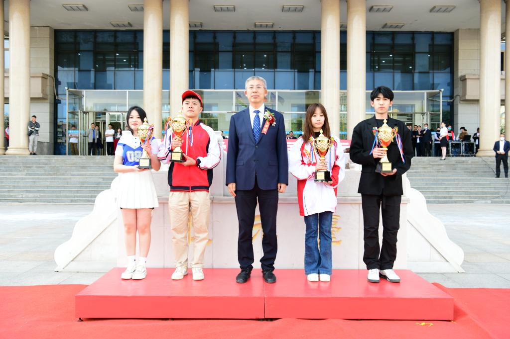经过激烈的角逐,数字商贸学院、建筑工程学院和智能制造技术学院分别荣获学生团体总分第一名、第二名、第三名;旅游与人文艺术学院、能源与汽车工程学院、会计金融学院和数字商贸学院荣获精神文明奖;智能制造技术学院荣获体育道德风尚奖;数字商贸学院荣获大会特别组织奖。学校领导分别为获奖代表队颁发奖杯。