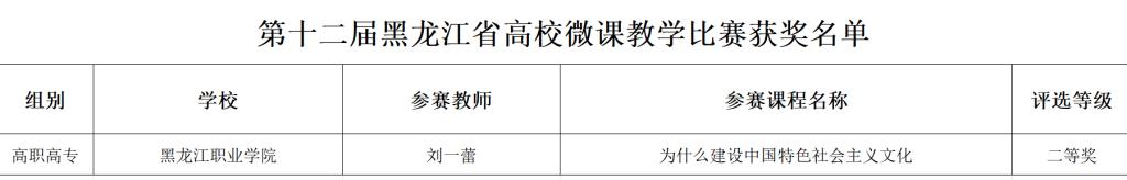 此外,经省教育厅批准,由黑龙江省高校师资培训中心举办的第十二届黑龙江省高校微课教学比赛落下帷幕,马克思主义学院教师刘一蕾作品《为什么建设中国特色社会主义文化》荣获高职高专组二等奖。