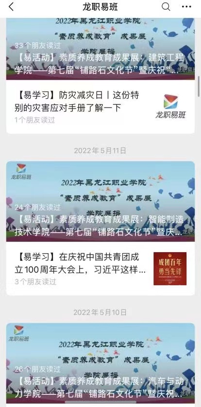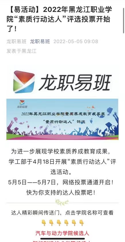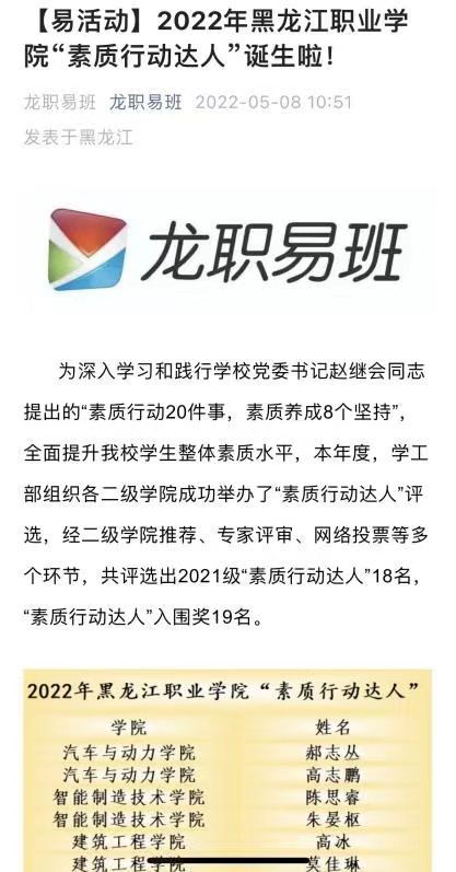 为进一步展现学校素质养成教育成果,营造积极向上、求实创新的学习氛围,引导学生养成良好习惯,促进学生素质全面提升,按照学校第七届“铺路石文化节”暨庆祝“龙职”成立10周年系列活动安排,4月18日至5月18日,学工部开展了“素质养成教育”成果征集、“素质行动达人”评选、二级学院“素质养成教育”成果展播等系列活动。