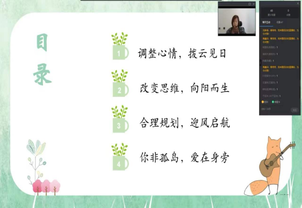本次课程通过在线教学,以“新学期‘心’准备”为主题,重点讲授了“调整心情、拨云见月,改变思维、向阳而生,合理规划、迎风启航,你非孤岛、爱在身旁”四项内容,通过疫情常态化的案例分析帮助学生正视了“封校管理”,转变了“封校=失去自由”的固有思维,建立了“封校=自我管理能力挑战”正确的思维模式。同时,对学生做好返校前的情绪管理和压力释放也起到了积极的指导作用。
