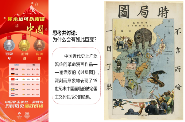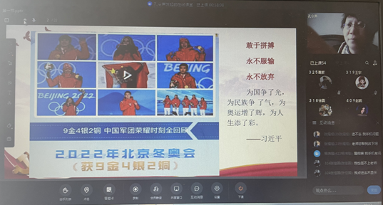 新学期第一课是线上课,时值2022北京冬奥会胜利举办,教师充分利用冬奥契机,带领学生回首奥运、再看冬奥,看今朝辉煌、忆往昔峥嵘,引导学生感悟我国的大国心态和绿色办奥兑现双碳目标,运动员顽强拼搏展现中国力量等。通过挖掘冬奥魅力和冬奥精神,勉励学生不负时代、不负青春,勇于挑战自我,在未来的人生道路上敢于担当、勇攀高峰,一起向未来。