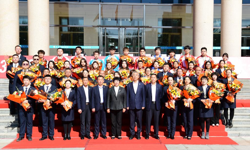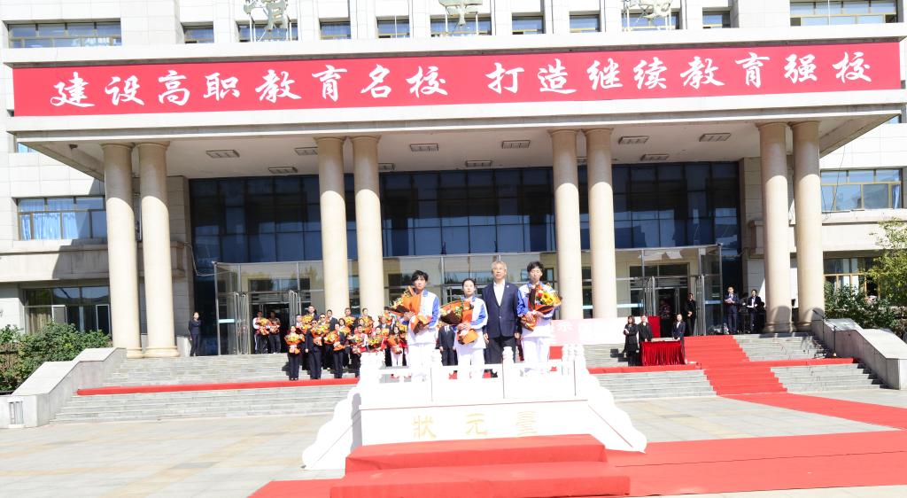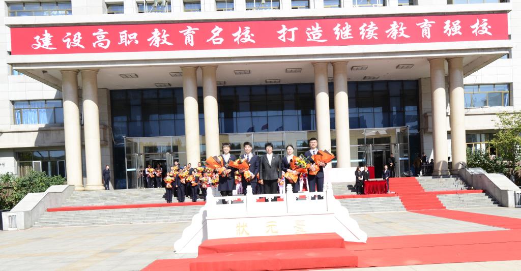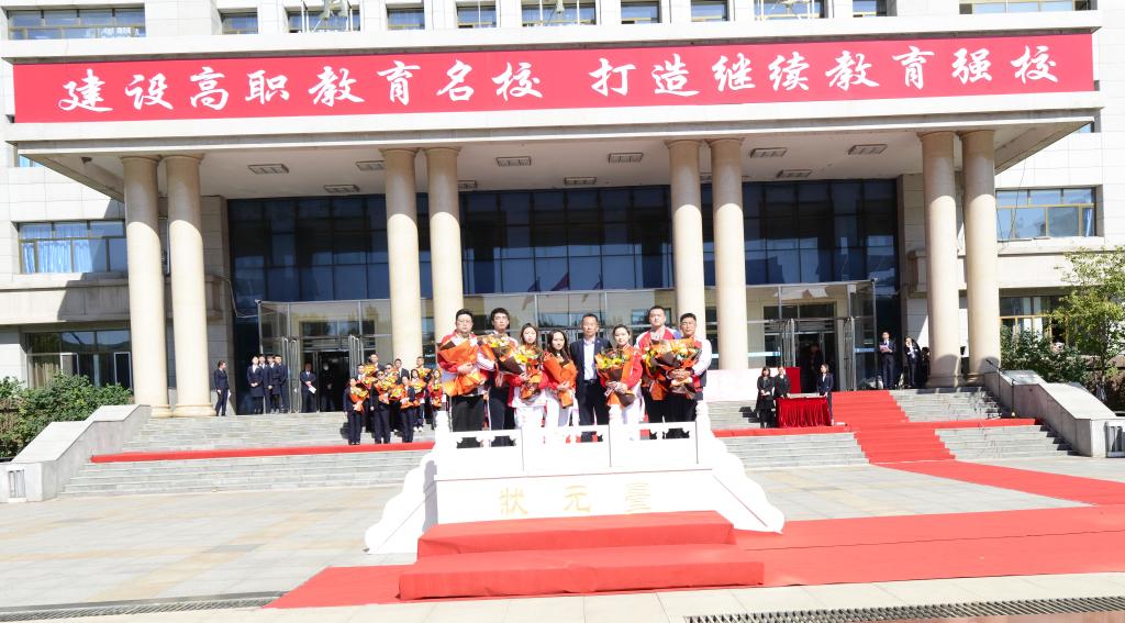 音乐响起,获奖者依次走上红毯,登上状元台,党委书记崔治春、校长王利文、党委副书记周家郁、纪委书记李伟、组织部部长钟敏强为7名金奖、7名银奖、17名铜奖获奖代表颁奖,并合影留念。