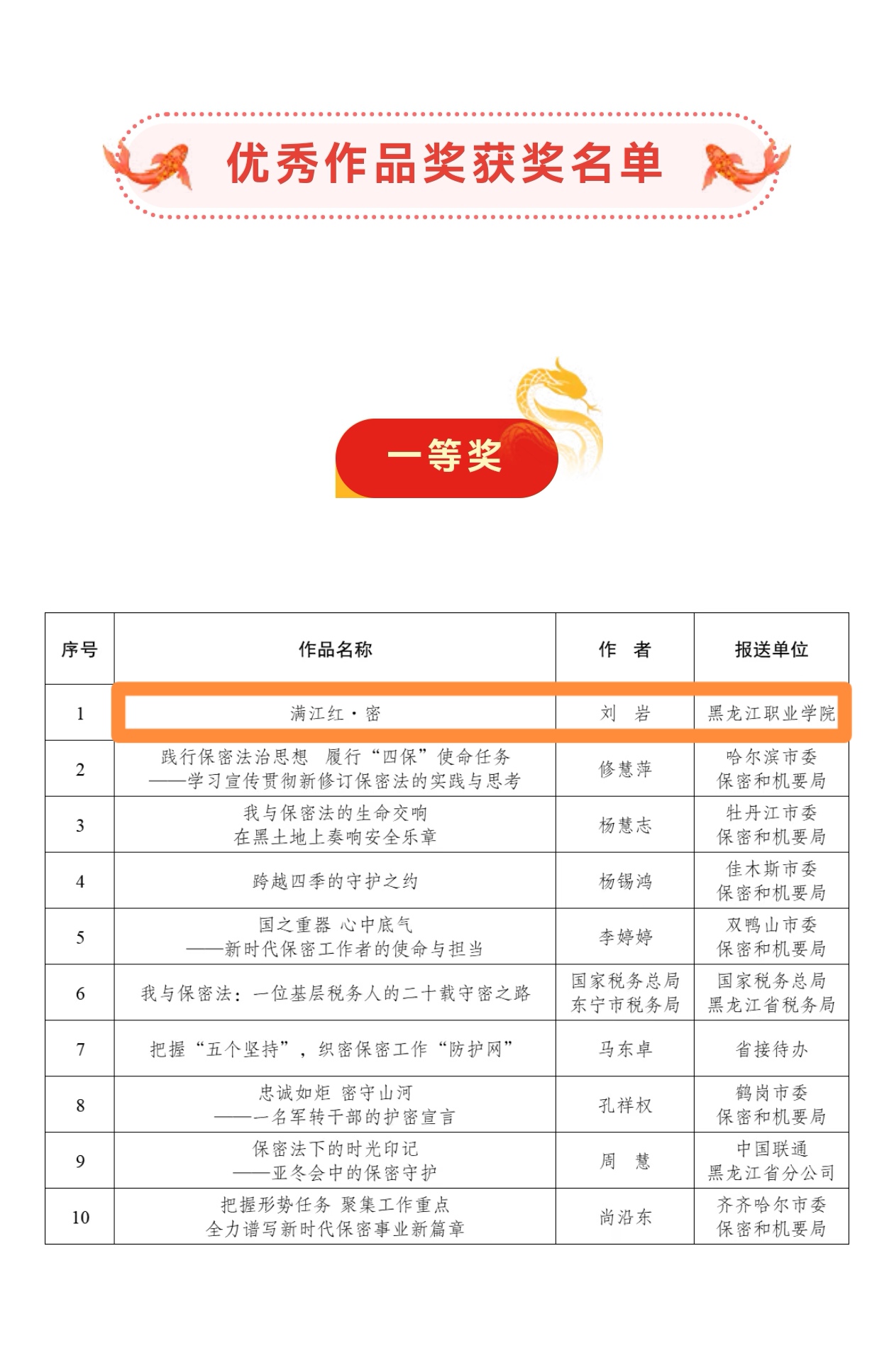 近日,中共黑龙江省委保密委员会办公室、黑龙江省国家保密局公布了“我与保密法”保密主题征文活动获奖名单。学校凭借扎实的组织工作和高质量的征文作品,荣获“优秀组织奖”称号,成为全省十家获此殊荣的单位之一,更是唯一获此奖项的高职院校。这一荣誉不仅是对学校保密宣传教育工作的高度肯定,更是学校长期以来重视保密工作、积极推动保密文化建设的有力见证。