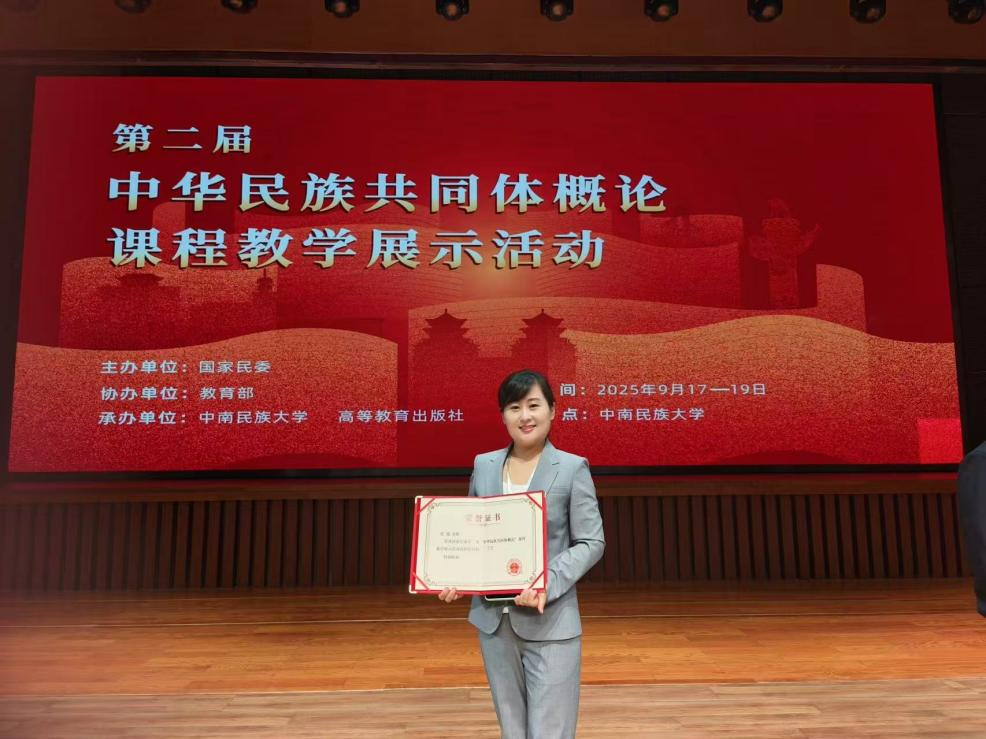近日,由国家民委教育司主办、教育部协办、中南民族大学和高等教育出版社承办的第二届“中华民族共同体概论”课程教学现场展示活动中,KY开元官网马克思主义学院思政课教师张旭表现优异,荣获全国二等奖。
