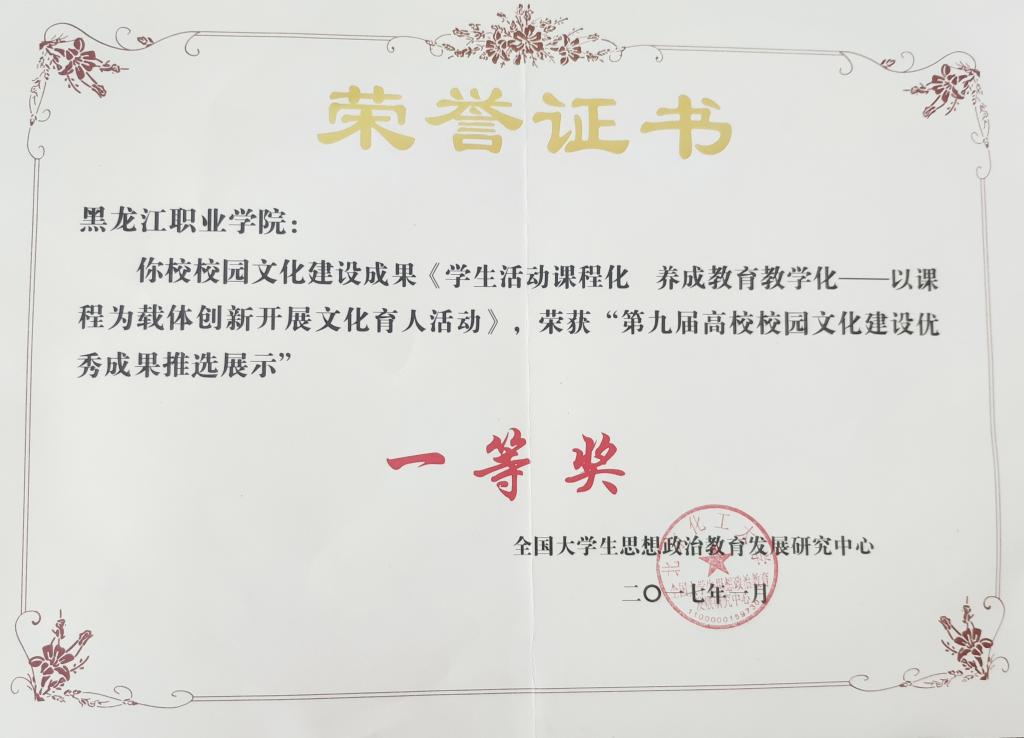 八年来,学校“学生活动课程化养成教育教学化”建设取得了丰硕的成果。2015年学校荣获“全国高校学生公寓工作优秀成果”一等奖;2017年“学生活动课程化养成教育教学化”项目荣获“第九届全国高校校园文化建设优秀成果”一等奖;2018年荣获“全国国防教育特色学校”荣誉称号;2019年在高教出版社出版国内首部《成果导向活动课程开发与实施》专著,学生在省第九届职业生涯与创业大赛中荣获特等奖和二等奖;2021年活动课程信息管理平台成功申报实用新型专利2项。