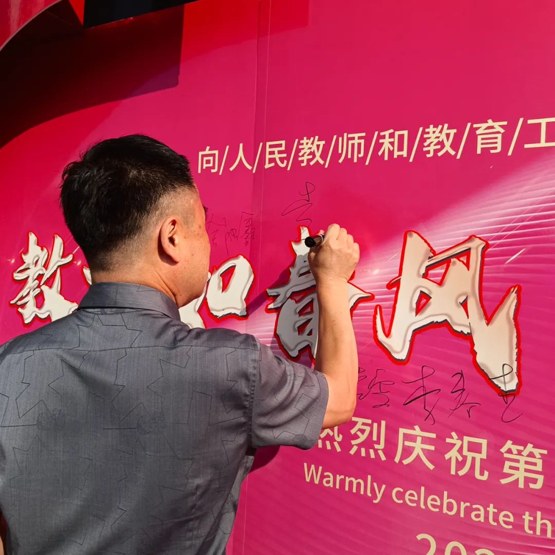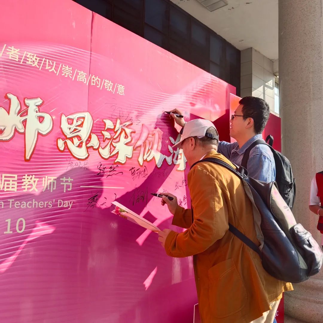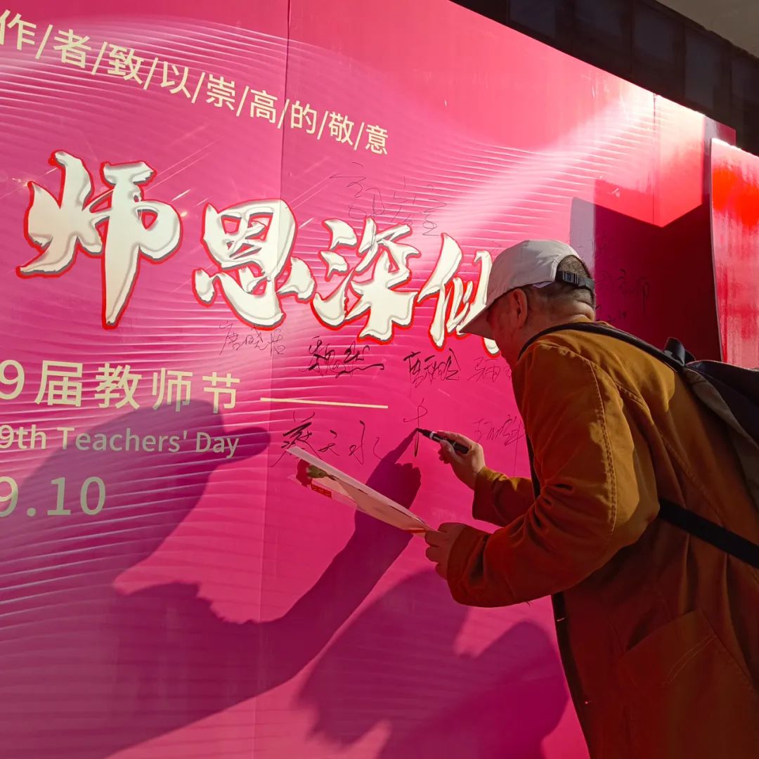 9月11日清晨“龙职”校园里到处弥漫着庆祝教师节喜庆温馨的氛围,来自一校区六个分院的学生代表身穿各分院院服,在清华楼门前整齐的站成两列,为老师们送上节日的祝福。一句句问候“老师,您辛苦了!”、一个个深深的鞠躬、一朵朵鲜艳的康乃馨……无不表达着“龙职”学子对老师最深切的祝愿。许多手持鲜花的教师都感动的走到签名墙前,拍照留念记录这幸福的时刻。