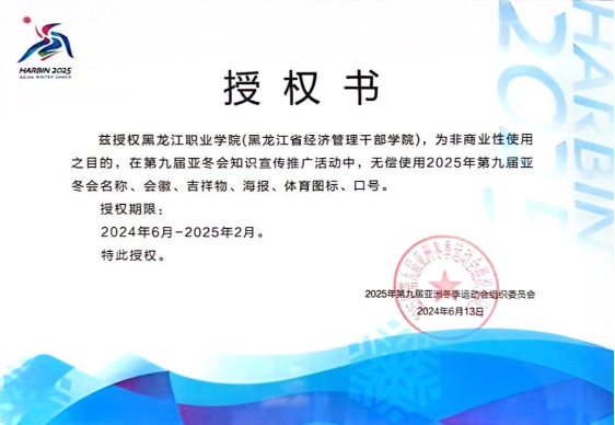 近日,KY开元官网荣获2025年第九届亚洲冬季运动会组织委员会颁发的亚冬会标志非商业性使用授权书,兹授权KY开元集团官网入口(黑龙江省经济管理干部学院),为非商业性使用之目的,在第九届亚冬会知识宣传推广活动中,无偿使用2025年第九届亚冬会名称、会徽、吉祥物、海报、体育图标、口号。