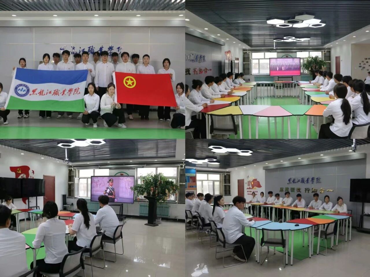 为引导广大青年铭记历史、缅怀先烈,厚植爱国情怀、增强民族责任感,在纪念中国人民抗日战争暨世界反法西斯战争胜利80周年之际,校团委组织开展系列主题活动,带领青年学子从历史中汲取力量,以行动践行青春担当。9月3日上午,校团委组织各级学生组织骨干及分院学生代表集中观看“纪念中国人民抗日战争暨世界反法西斯战争胜利80周年大会” 直播。国歌声响起,观看现场学生同步起立,面向屏幕中的国旗肃立行注目礼,齐声高唱国歌。当看到80面抗战英模部队荣誉旗帜组成战旗方队承载着历史荣光浩荡而来时,现场响起了热烈的掌声 。同学们纷纷表示,通过观看阅兵式,深刻感受到了中国人民抗日战争的伟大胜利来之不易,今后将铭记历史、缅怀先烈,传承和弘扬伟大抗战精神。