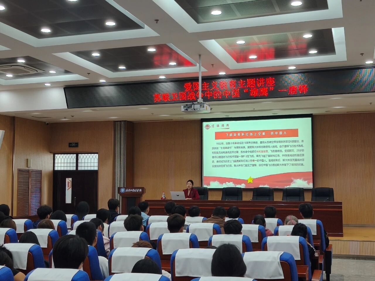 讲座中,主讲人以唐铎的革命历程为主线,结合纪念馆内珍藏的史料文献与实物展品,生动还原了这位“中国雄鹰”的传奇人生:从远赴苏联学习航空技术的初心,到投身苏联卫国战争、驾驶战机冲锋陷阵的英勇事迹,再到始终坚守的爱国情怀与国际主义精神,宣讲团通过详实的历史细节与感人的斗争故事,让在场学生跨越时空,深刻感受到唐铎为世界反法西斯事业作出的卓越贡献,以及革命先辈身上坚定的理想信念与使命担当。
