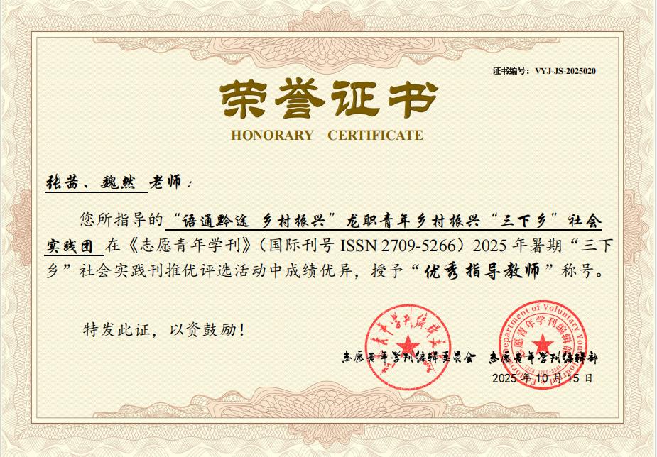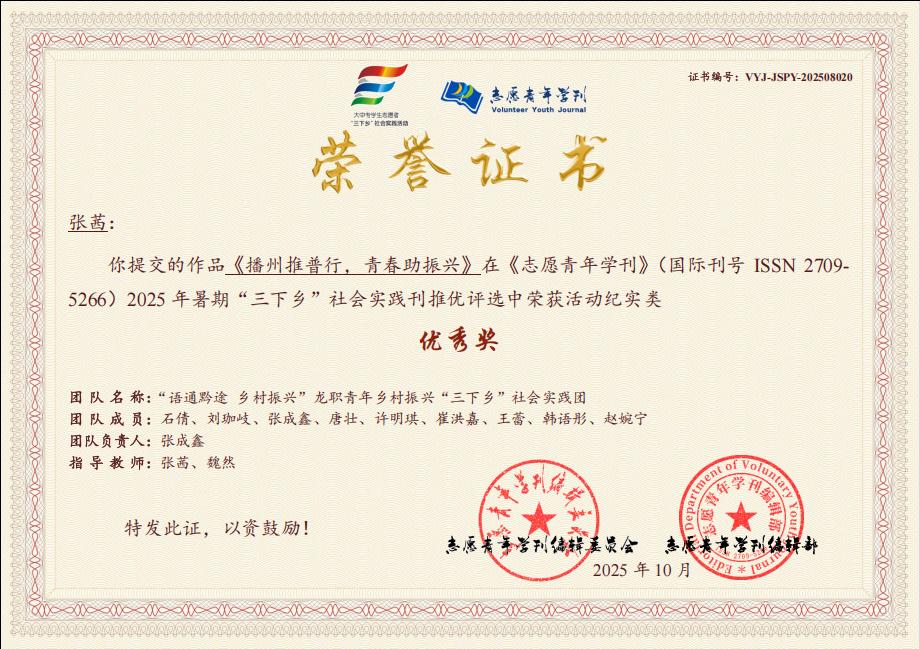 《志愿青年学刊》编辑部2025 年暑期“三下乡”社会实践刊稿件征集评选活动结果公布。校团委“语通黔途 乡村振兴”龙职青年乡村振兴“三下乡”社会实践团在《志愿青年学刊》(国际刊号 ISSN 2709- 5266)举办的2025年暑期“三下乡”社会实践专刊稿件推优评选活动中荣获优秀奖,张茜、魏然、荣获优秀指导教师。