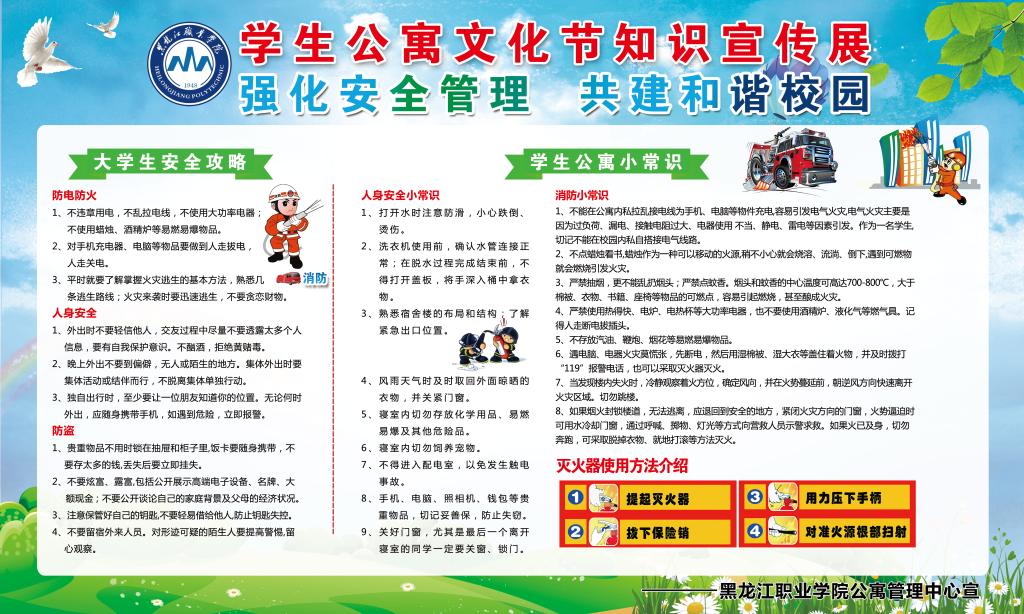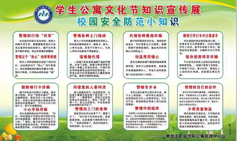 为进一步落实“不忘初心,牢记使命”主题教育活动,广泛宣传安全知识、强化学生自我保护意识,保障学生生命财产安全。自10月23日起,公寓管理中心组织开展了安全知识宣传巡展。本次知识巡展包括五个部分:一是学生公寓安全管理相关知识展;二是校园安全防范小知识展;三是垃圾分类知识展;四是优秀标准化寝室展;五是创建“无烟公寓”倡议书。