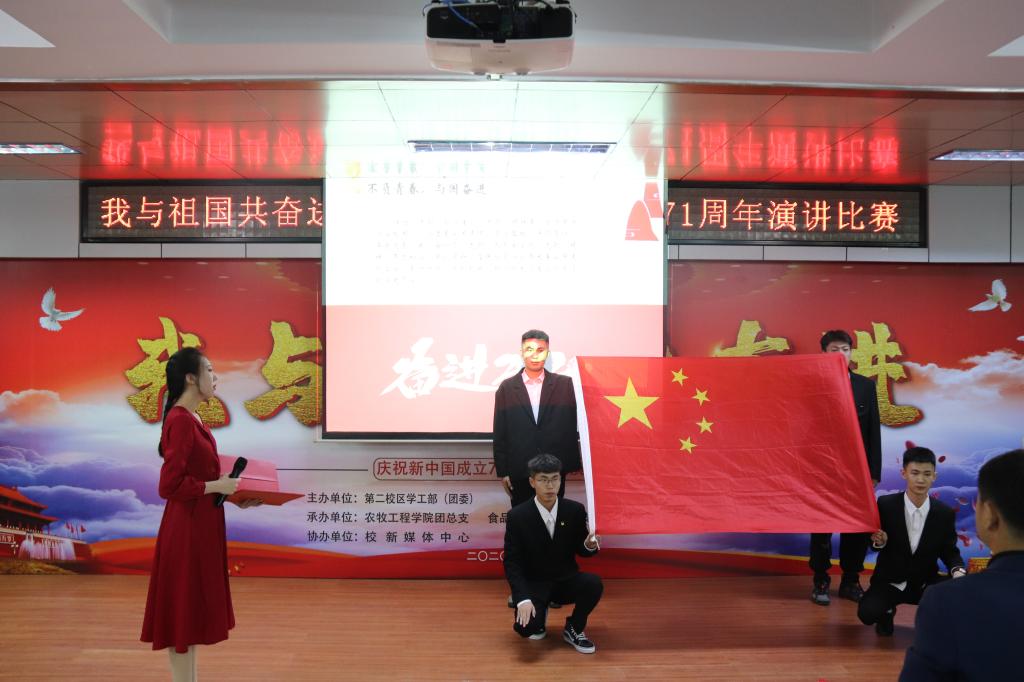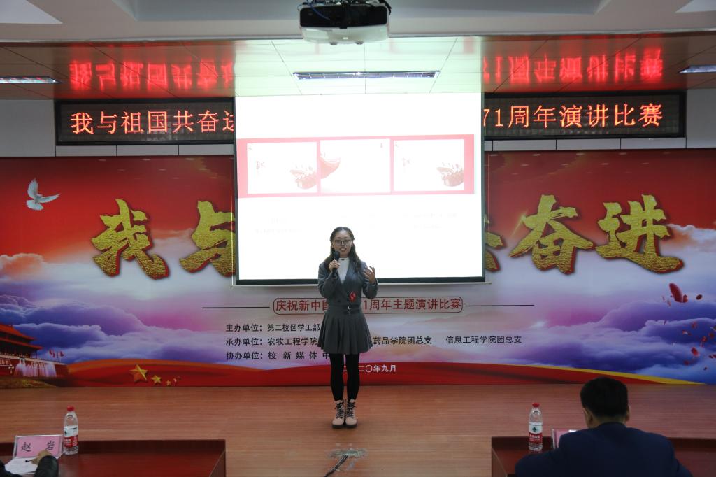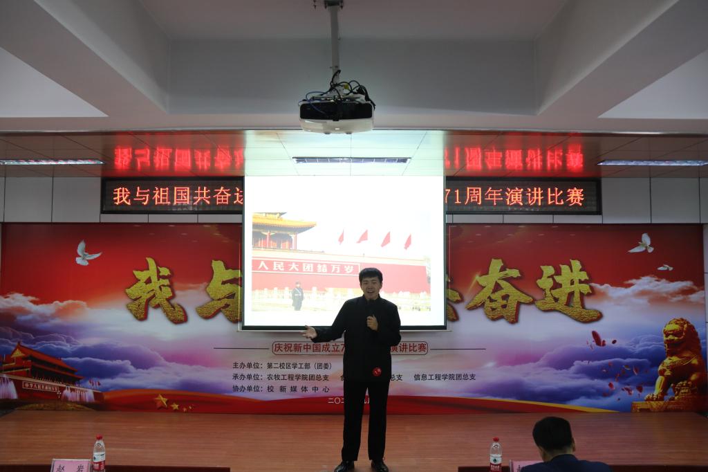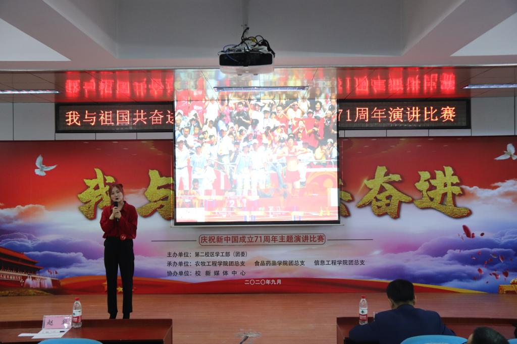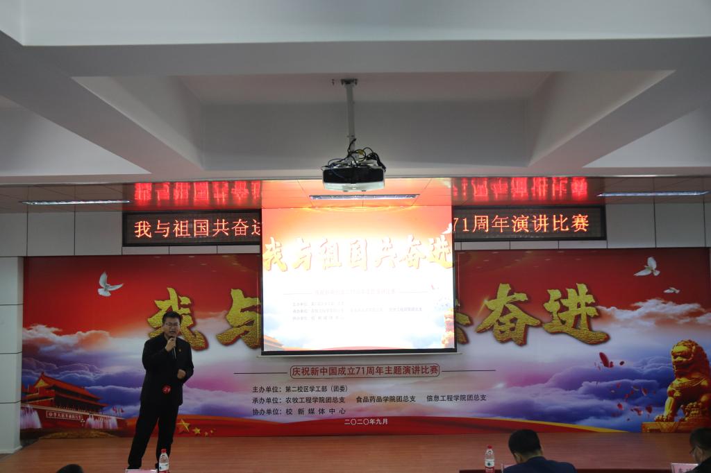 2020年9月29日,第二校区学工部(团委)组织开展“我与祖国共奋进——庆祝新中国成立71周年”主题演讲比赛。学工部副部长赵彦生、农牧工程学院党总支副书记赵岩、食品药品学院党总支副书记车延平、信息工程学院党总支副书记张晓霖,以及学工部各科室负责人和各二级学院团总支书记等参加活动,并特邀思政教研室主任张丽艳、通识教育学院中文教研室副主任汤艳玲、通识教育学院体育教研室副主任韩秀红担任评委。