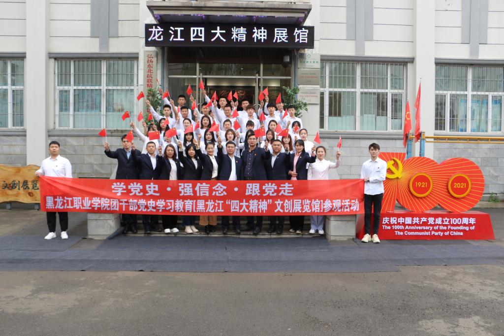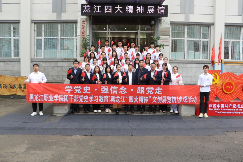 在中国共产党成立100周年之际,为深入学习习近平总书记在党史学习教育动员大会上的重要讲话精神,扎实推动党史学习教育走深走实,培养学生的爱国情怀,5月7日,校团委组织专职团干部和校院两级主要学生干部近50人赴哈尔滨学院,开展“学党史·强信念·跟党走”党史学习教育“黑龙江四大精神”文创展览馆参观活动。