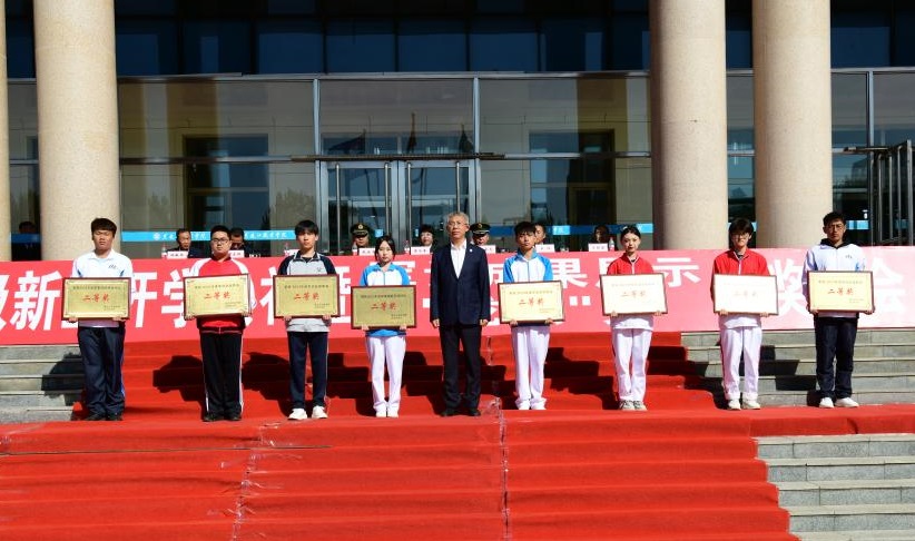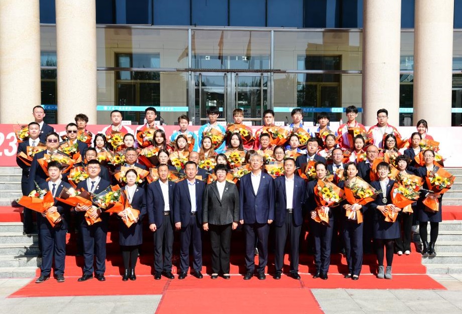 ▲学校办公室主任王东、学生工作部部长赵彦生与分列式优秀奖代表合影