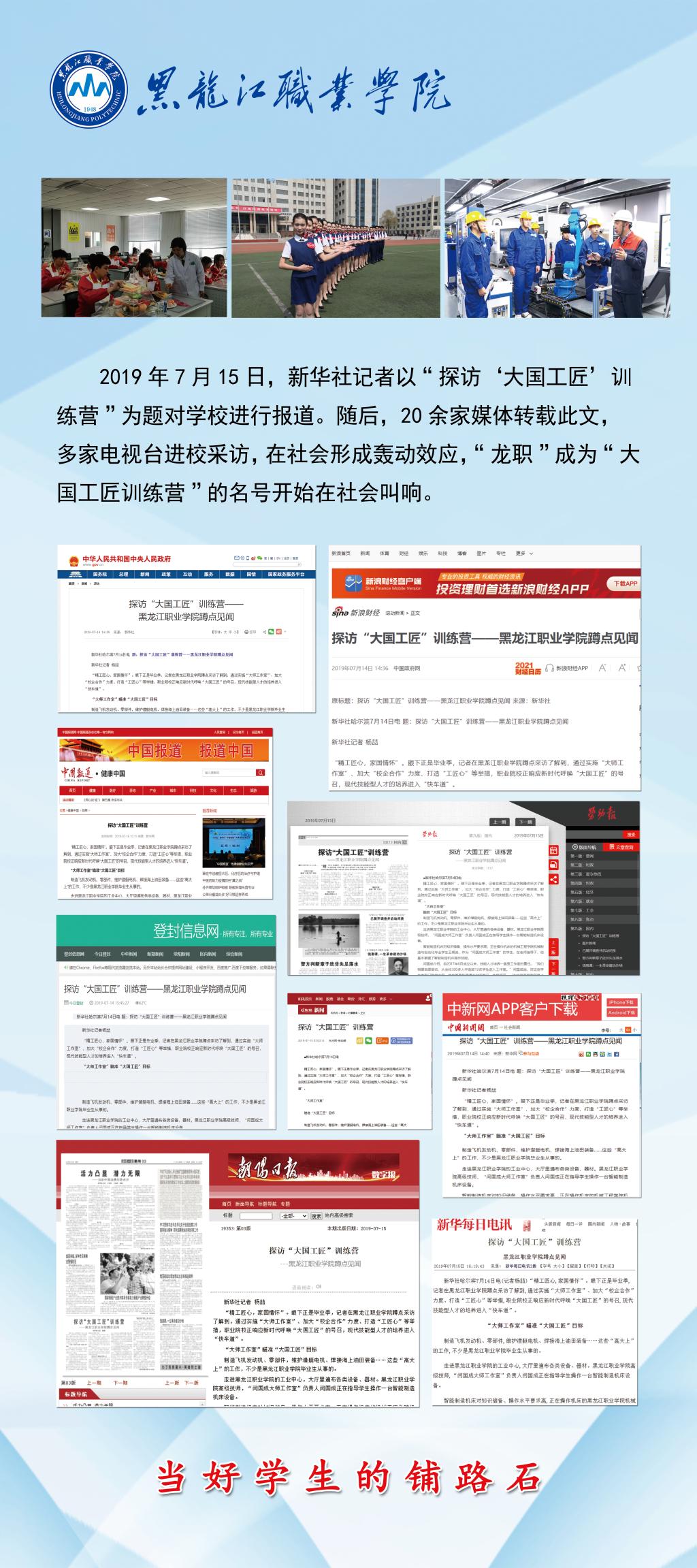 在“铺路石”精神引领下,学校校友中涌现出全国人大代表、全国五一劳动奖章获得者、全国劳动模范、大国工匠、行业首席科学家、技能大师、改革先锋等,以实际行动谱写了“龙职”精神的时代风采、诠释了“铺路石”文化的奋斗本色。新华社、人民日报、央广网、中国教育网、中国教育电视台等国家级媒体,纷纷报道学校“铺路石”文化育人特色与成效,赞誉学校是“大国工匠训练营”。