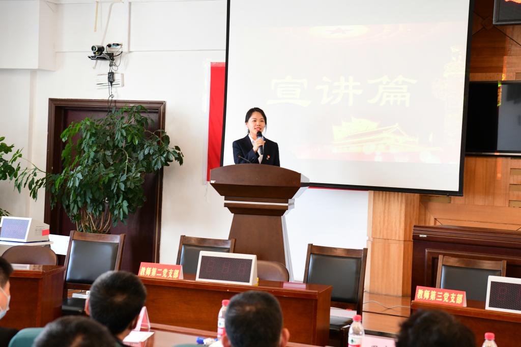 崔治春指出,通识教育学院率先将习近平新时代中国特色社会主义思想和党建元素融入机房建设,把机房打造成红色教育基地和课程思政示范基地;将优秀传统文化、红色文化和龙职文化融入课程思政,承担起传承优秀传统文化、传播红色文化、践行龙职文化的神圣使命,叫响了“文化自信强、通识心向党”的党建品牌;将学习和竞赛活动紧密结合,领导班子带头组队参赛,以赛促学检验主题教育阶段学习成果,为深入持续开展主题教育打牢了思想和理论基础;将榜样的引领作用发挥到最大,通过讲述“最美铺路石”的感人事迹,坚定全体教师践行“当好学生的铺路石”的价值追求;将誓言化为动力,全体教师在铮铮誓词中,进一步坚定对党忠诚、不负人民,为党育人、为国育才的理想信念和在新时代新征程的伟大实践中再立新功的决心和信心。