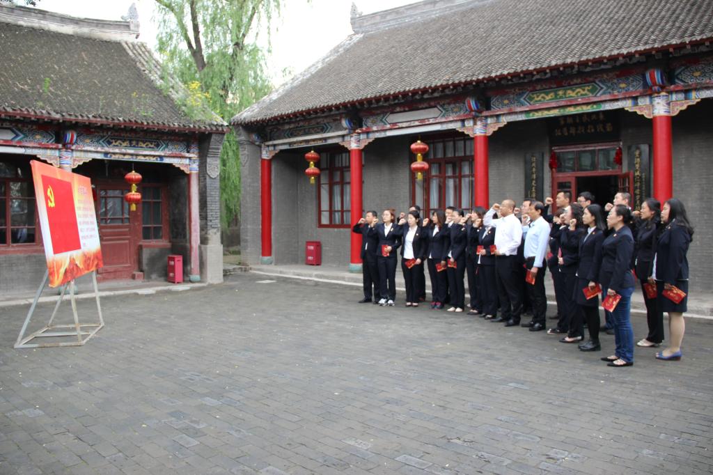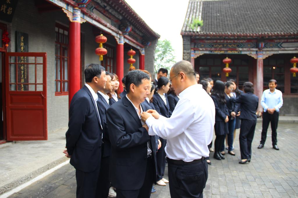 参观后,党总支书记孔繁海,院长、党总支副书记彭秋艳在指挥部的院落里为全体党员佩戴党徽、发放政治生日贺卡,并重温入党誓词,这让此次主题党日活动更有意义更有价值!