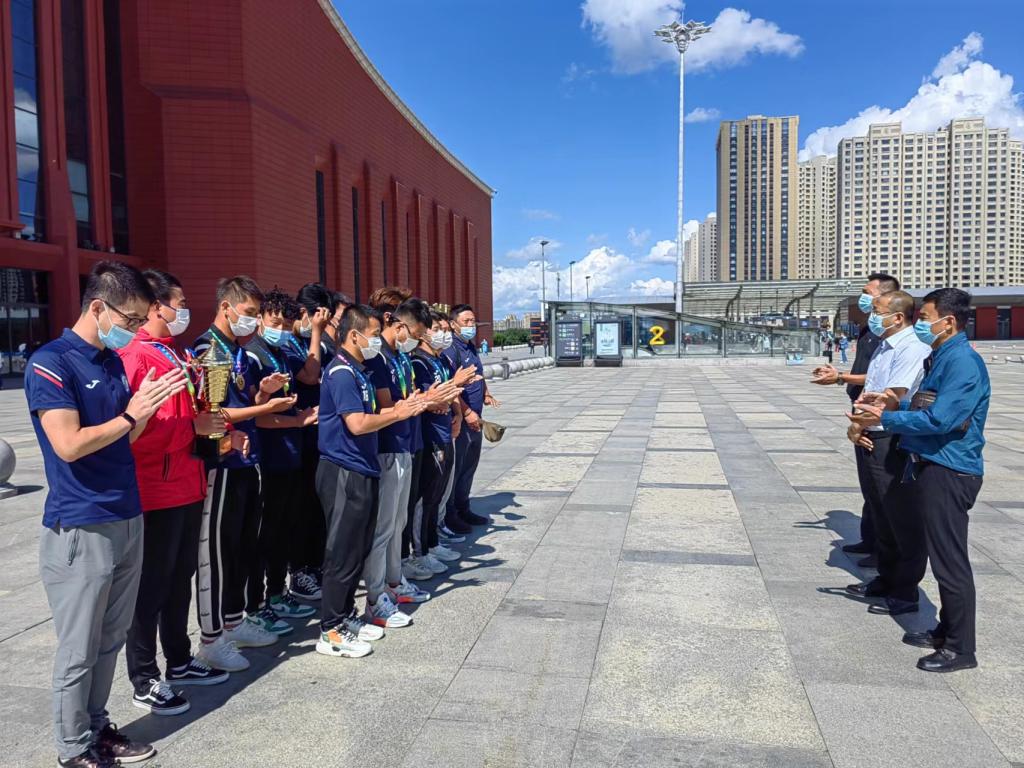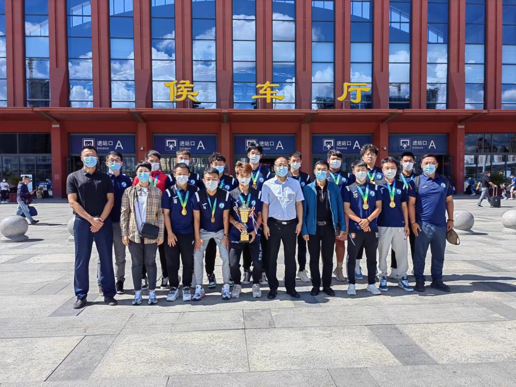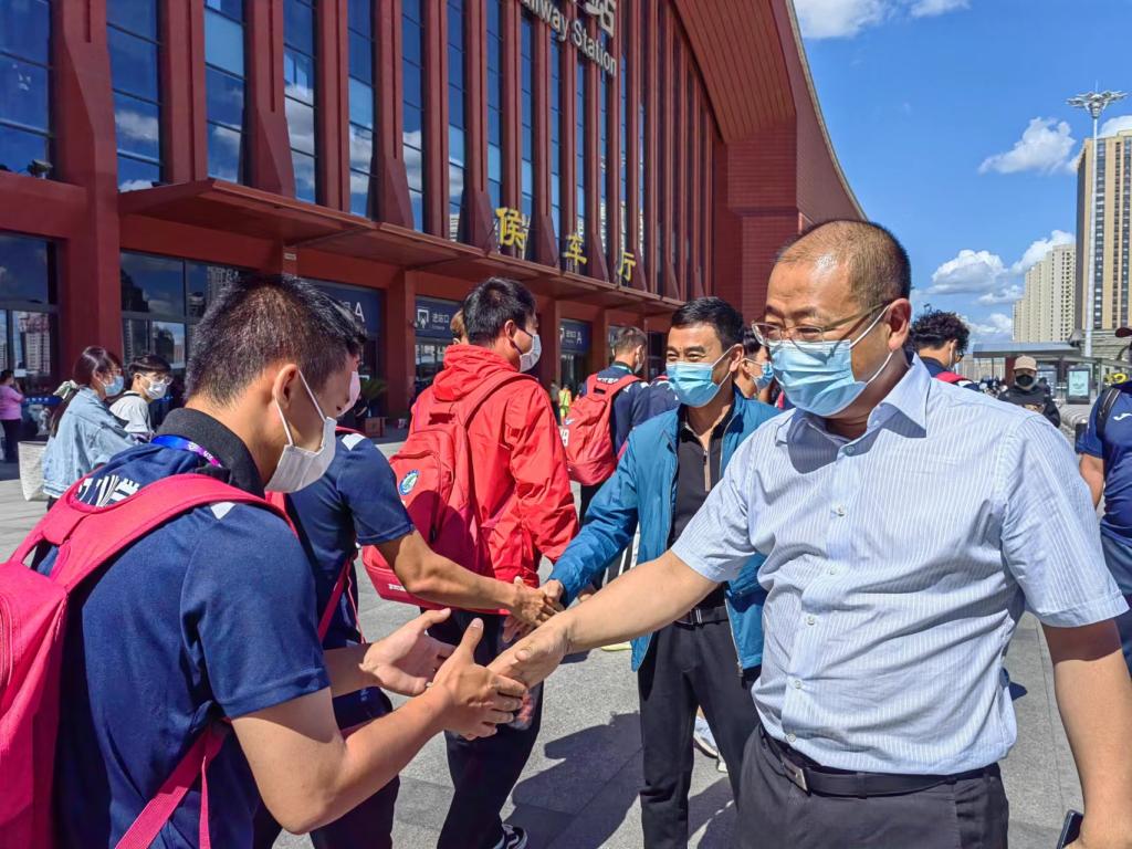 经过近一个月的艰苦训练和激烈的比赛角逐,队员们的脸上略显疲惫,但是眼神中充满着坚毅。绿茵场上他们挥洒汗水、顽强拼搏,以优异的成绩完成比赛,实现了在大运会赛场上对自己的超越,加冕王冠。对此,通识教育学院领导班子对全体教练员和队员的辛苦付出予以肯定。班子成员到火车站迎接大家凯旋归来,亲切慰问并与队员们一一握手、合影留念。党总支书记孔繁海、院长侯继勇充分肯定大家的辛苦努力,在当前疫情的大环境下,大家能够艰苦训练并取得优异成绩既是为学校赢得荣誉,也是对自己努力的一种回报,希望队员们在以后的学习和生活中能一直保留这种不畏艰难、奋勇拼搏的精神,继续扬帆远航,取得更多、更好的成绩!