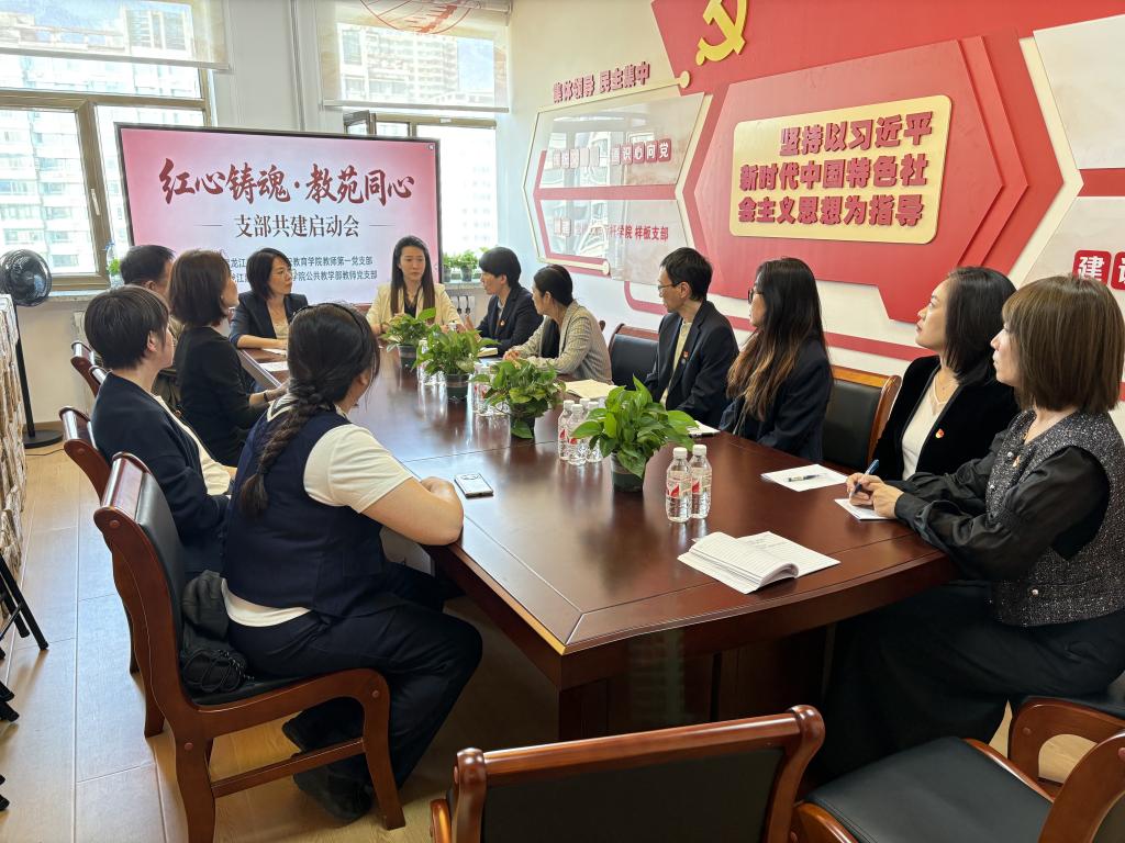 通识教育学院院长田文君首先对黑龙江建筑职业技术学院一行表示热烈欢迎,系统介绍了学院的基本情况、党建“传统文化强通识心向党”特色品牌的创建历程、主要成效与亮点。双方期待以此次共建为契机,推动两支部在未来实现“三共”目标,即“共学、共研、共进”,通过理论共学、课题共研、发展共进,切实增强基层党组织功能,提升育人实效。