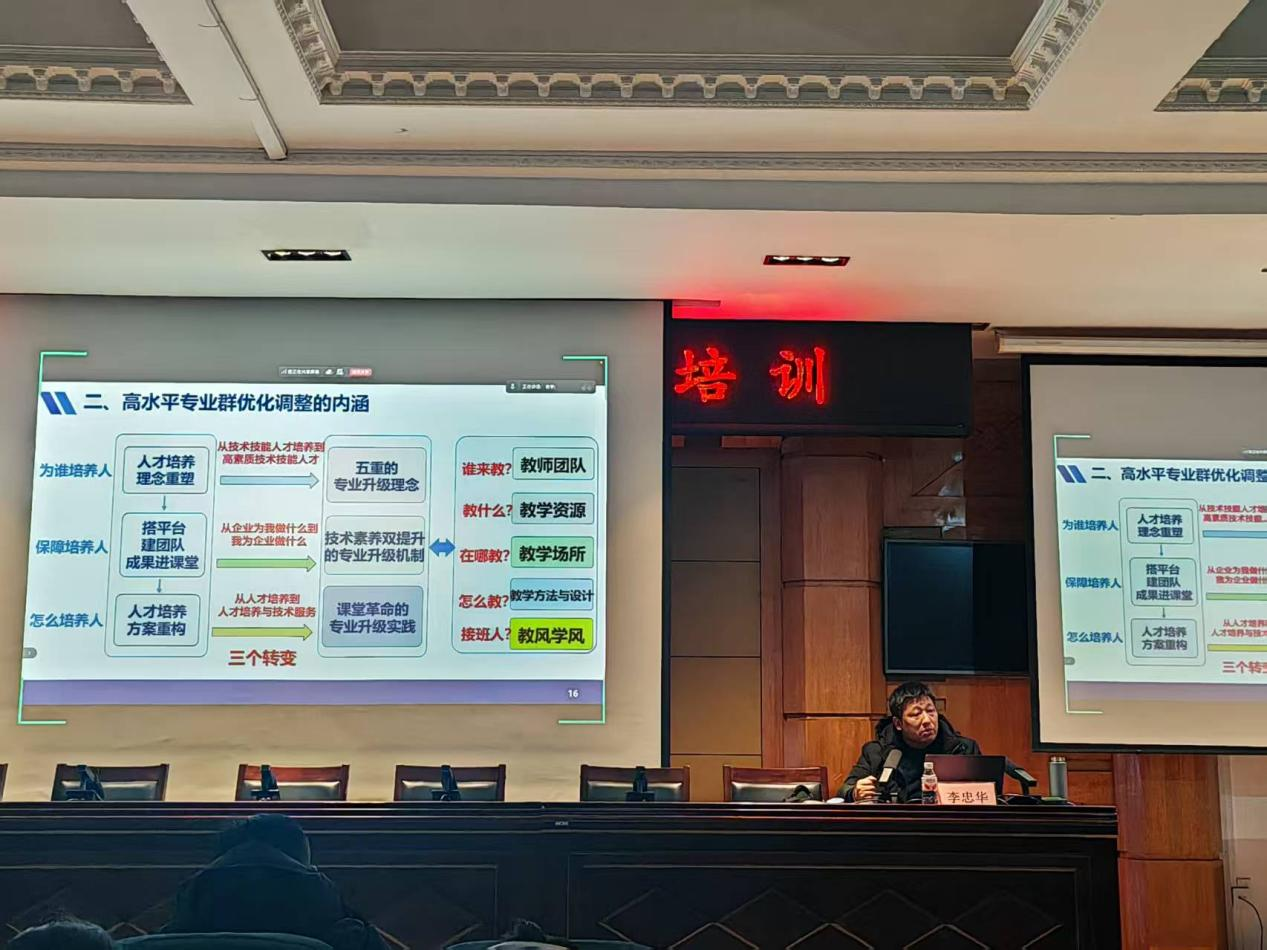 此次培训特邀湖南汽车工程职业大学李忠华教授担任主讲。李教授围绕需求导向下的专业群重构、高水平专业群优化调整内涵、新质生产力背景下的建设路径三大核心内容系统展开讲解,并结合多所院校专业建设的典型案例,为参训人员提供了兼具理论高度与实践价值的专业指导。