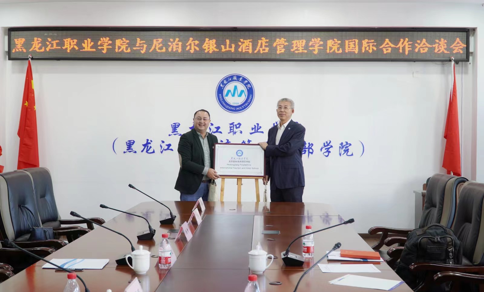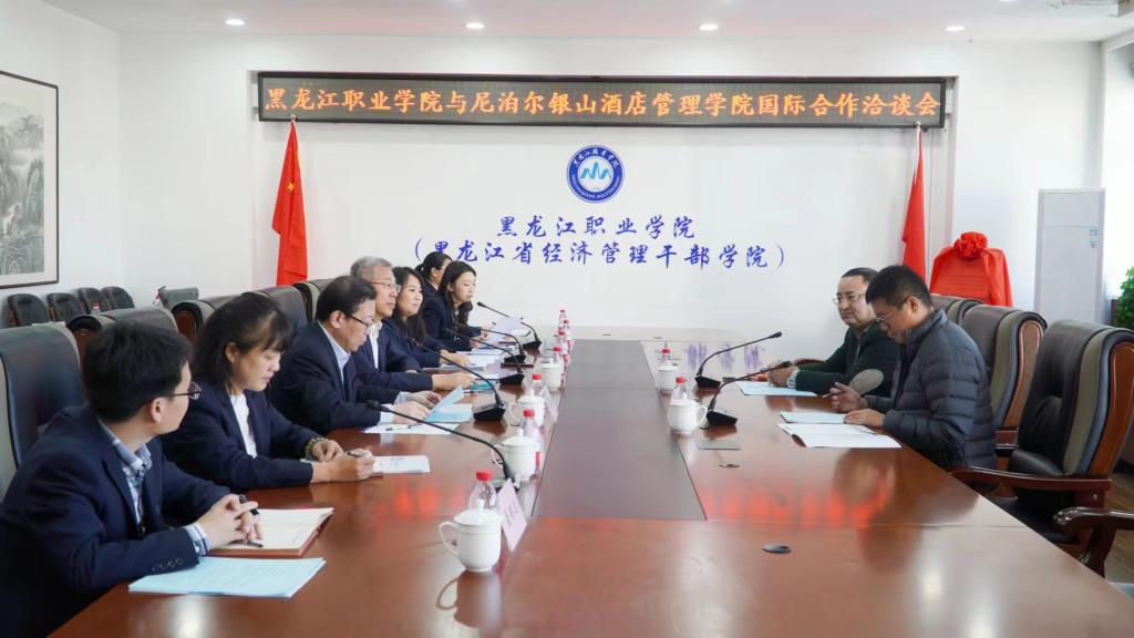 会议中,双方就成立中尼酒店数字化教育联盟、合作办学、学分互认、师生交流、咖啡师项目推广、课程共建等问题进行了深入的探讨及磋商并达成共识。双方还对其他专业领域合作表示出强烈的兴趣及期望。会谈结束后,举行了“国际教育合作伙伴”揭牌仪式。