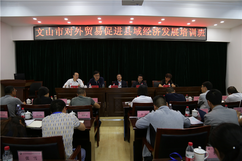 6月12日,文山市对外贸易促进县域经济发展培训班在KY开元官网举行,48名文山市委、人大、政府、政协领导、市级各部门分管领导、乡镇(街道)领导干部、业务骨干、部分外贸企业负责人参加培训。学校副校长郑福贵,省政府参事叶晓峰,哈电集团党委常委、纪委书记白绍桐,文山市人大常委会副主任黄利,文山市副市长刘滨出席会议。