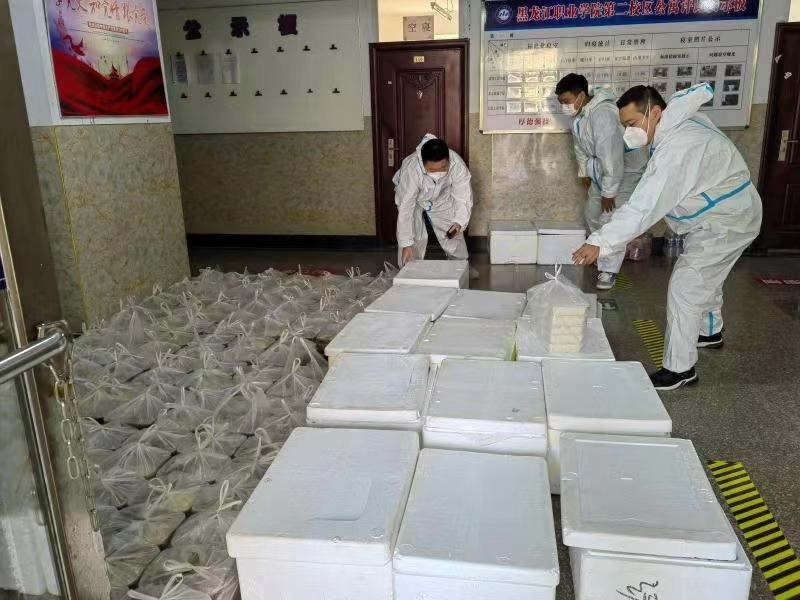 学生返校后,学院第一阶段志愿者由王英侠院长带领学院四名志愿者鲍庆丰、杨林、逄小夫、丛雅琼老师第一时间下沉至一二校区,承担返校学生隔离区管理和三餐供给等后勤保障工作。因入校学生数量每天都有新增,为了让学生尽快吃到可口、热乎的饭菜,王英侠院长所在的送餐工作组,把饭菜、水果、酸奶按照楼层进行精准分装,每天楼上楼下搬运着近三百份的餐食,起早贪黑,似乎早已忘记了疲惫和饥饿,她们心里只想着快点把饭菜送到学生寝室楼下,老师们的辛苦没有白费,学生们感到非常满意。