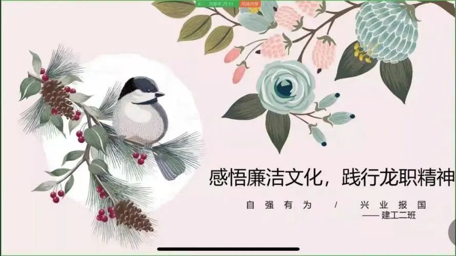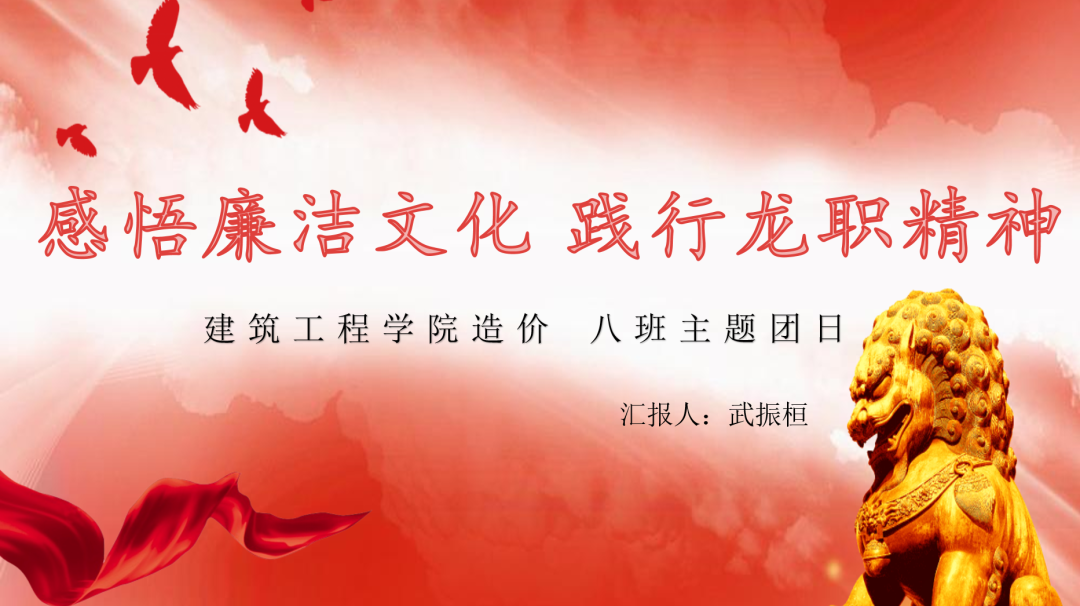 为进一步推动我院廉洁文化建设,培养我院学生养成“知廉、爱廉、行廉”的道德情操和模范行为,将廉洁文化充分与“自强有为,兴业报国”的龙职精神相结合,建筑工程学院于11月17日特此开展“感悟廉洁文化,践行龙职精神”线上主题团日活动。