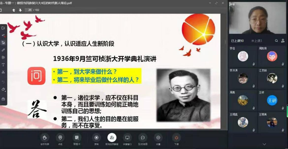 经过认真准备,周敏和王丽老师在云端网络与新生们见面了。两位老师以问题导向和互动研讨开启了2022级新生第一节思政课,学生们精神饱满、答题踊跃,展现出了大学生应有的精神风貌。两位老师为本学期课程打下一个良好的开端。