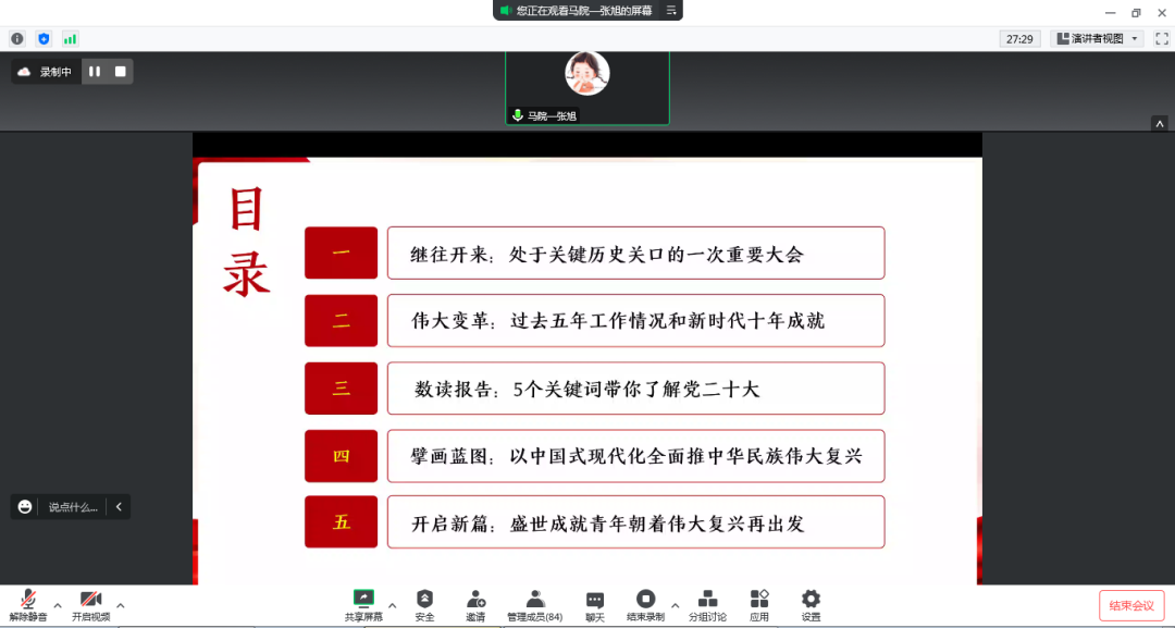 为进一步深入学习贯彻党的二十大精神,12月7日下午,建筑工程学院通过线上会议的形式举行学习贯彻党的二十大精神宣讲报告会。按照学校党委统一部署,学校宣讲团成员、马克思主义学院张旭教授以“思想伟力领航向 强国有我再出发”为题,为学院党员干部、师生作党的二十大精神宣讲报告。学院党总支书记范海波、院长张皓、党总支副书记孙若鹏、副院长英鹏程参加报告会。报告会由孙若鹏主持。