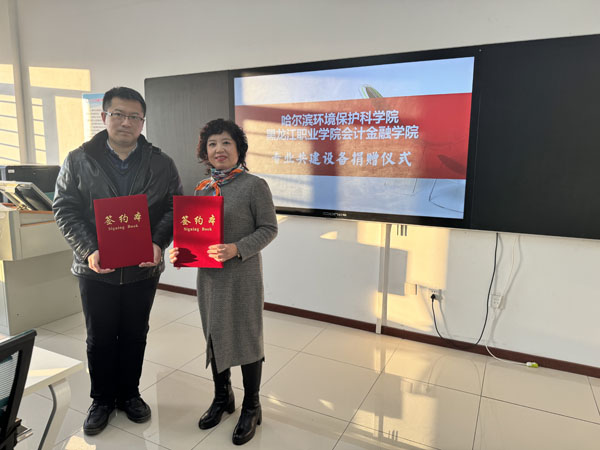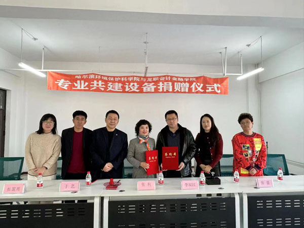 捐赠仪式在工匠楼资产评估实训室举行。学院院长张利、哈尔滨环境保护科学院院长李双江、学院副院长杜国用、哈尔滨环境保护科学院办公室主任张蕾、科研与校企合作处于艺副处长、刘皓淼主任以及资产评估教研室主任陈艳梅参加捐赠仪式。