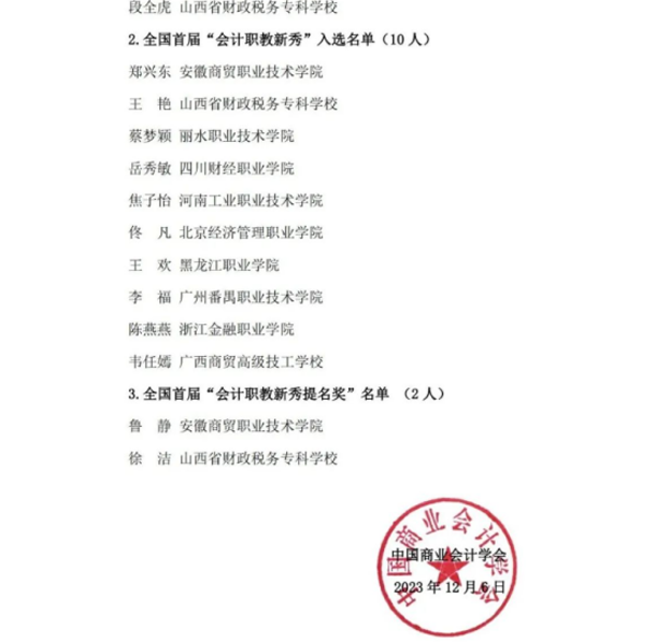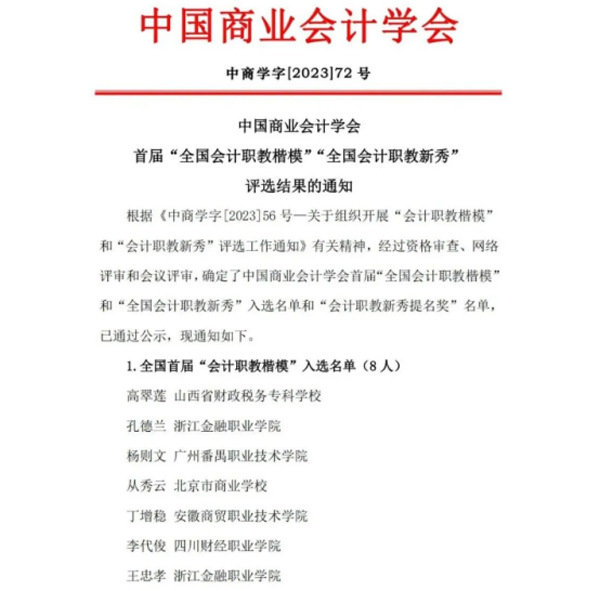 12月6日,在中国商业会计学会职业教育分会组织的首届“全国会计职教楷模”“全国会计职教新秀”评选活动中,会计金融学院教师王欢被评为全国首届“会计职教新秀”,全国职业院校共有10人获此殊荣。