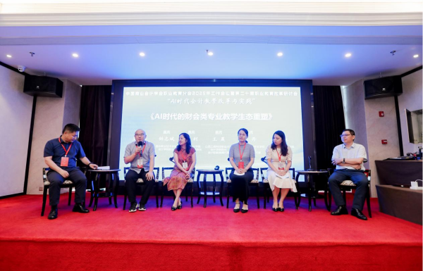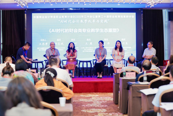 当日下午,张利院长参与了“AI时代的财会类专业教学生态重塑”圆桌讨论环节。面对AI技术给传统财会教育带来的巨大冲击与全新机遇,张利院长结合会计金融学院教学改革的创新与突破及行业发展趋势,进行了经验分享及对AI背景下,财会专业建设的展望。她指出,财会专业教育必须主动拥抱AI技术,将其融入教学改革的各个方面,要着重培养学生的数据分析、智能决策等新型能力,以适应行业变革需求。除张利院长外,其他与会专家也围绕会议主题展开深入讨论。