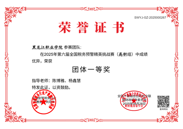 2025年8月1日—8月22日,在第六届“衡信杯”全国税务预警精英挑战赛中,会计金融学院由陈博雅、杨鑫慧组成的指导教师团队,组织大数据与财务管理专业、大数据与会计专业共35名学生积极参赛,最终在全国68所高职院校竞技中获得全国总排名第一、团体一等奖的好成绩。冯骄阳、苏嘉伦、王琪、任政睿、唐静等24名学生脱颖而出,进入全国排名前50,获得“税务预警风控大使”荣誉,2位指导教师分别获得“全国优秀指导教师”称号。