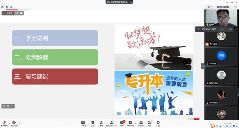 为帮助学生了解更多专升本信息,做好未来的学习规划,10月7日18:00-19:00,会计金融学院教学第一党支部利用腾讯直播开展了“助力升本 筑梦青春”线上专题讲座。此次讲座由会计金融学院教学第一党支部书记杜国用老师主讲,刘晓欧老师主持,孙丽娜、于涵、孙海涛老师列席。2019级会计、会计信息管理、财务管理专业176名学生参加了专题讲座。