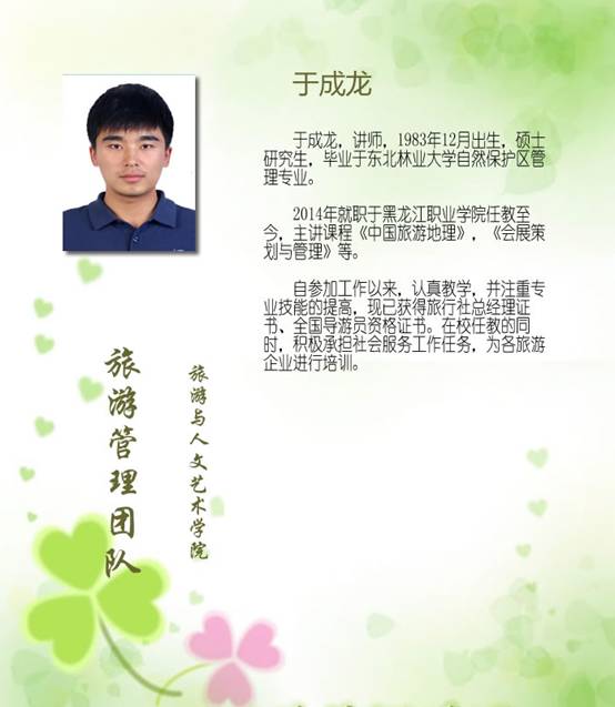 陈洪宏,旅游管理专业教研室主任,副教授,管理学硕士,全国导游人员资格考试口试官,黑龙江省职业院校学生技能大赛暨全国职业院校技能大赛选拔赛中职组导游服务赛项裁判,拥有全国导游员资格证书、出境领队证、旅行社总经理等证书。近年来,主持和参与各类课题24项,公开发表论文10余篇,编写高职高专类教材8本。指导学生获得全国职业院校技能大赛导游服务赛项(即国家A类大赛)三等奖一项,国家B类专业大赛二等奖一项、三等奖两项,黑龙江省级导游服务大赛二等奖两项。