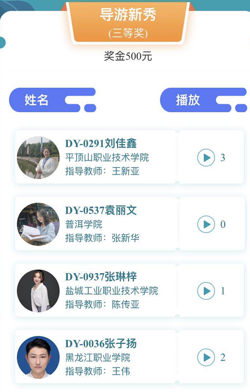 近日,“美丽中国,游我来说”,第一届“最美校园导游讲解员”全国大赛圆满落幕,此次大赛共有195所院校,1419名选手报名参加,收到有效作品1205份。经过入围筛选、大众投票、专家评审等多个环节,学校2018级旅游管理专业学生张子扬荣获大赛三等奖,获得“导游新秀”称号,奖金500元,是黑龙江省唯一获奖选手。在日常教学中,学校旅游管理专业教学团队多措并举提升人才培养质量,通过鼓励学生参加专业技能大赛和实践技能活动,采取“以赛促教、以赛促学、以赛促用”的形式,既激发了学生专业学习兴趣,也显著提高了学生专业技能和职业素养,充分展现学生良好的精神风貌,为其今后走上工作岗位打下了坚实的基础。