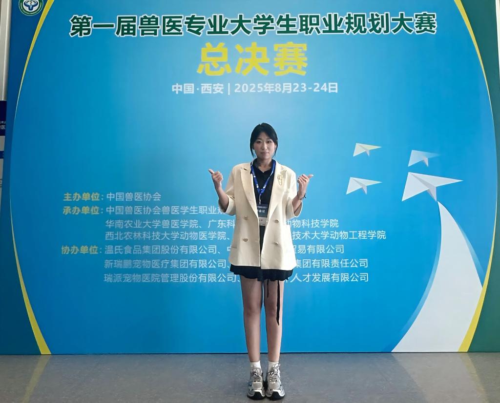本届大赛自2025年4月启动以来,吸引了全国90余所兽医专业本科及高职院校的近400名在校生踊跃参与。经过初赛筛选,最终36所本科院校与37所高职院校的73名精英选手会师西安,于8月23—24日展开全国总决赛的巅峰对决。作为黑龙江省高职院校的代表,王雪同学以初赛第一名的成绩晋级,并在总决赛中凭借“精研兽医学笃行医者心”的精准职业定位、科学系统的成长规划,以及现场展示的扎实专业技能与临场应变能力,赢得评委一致好评。