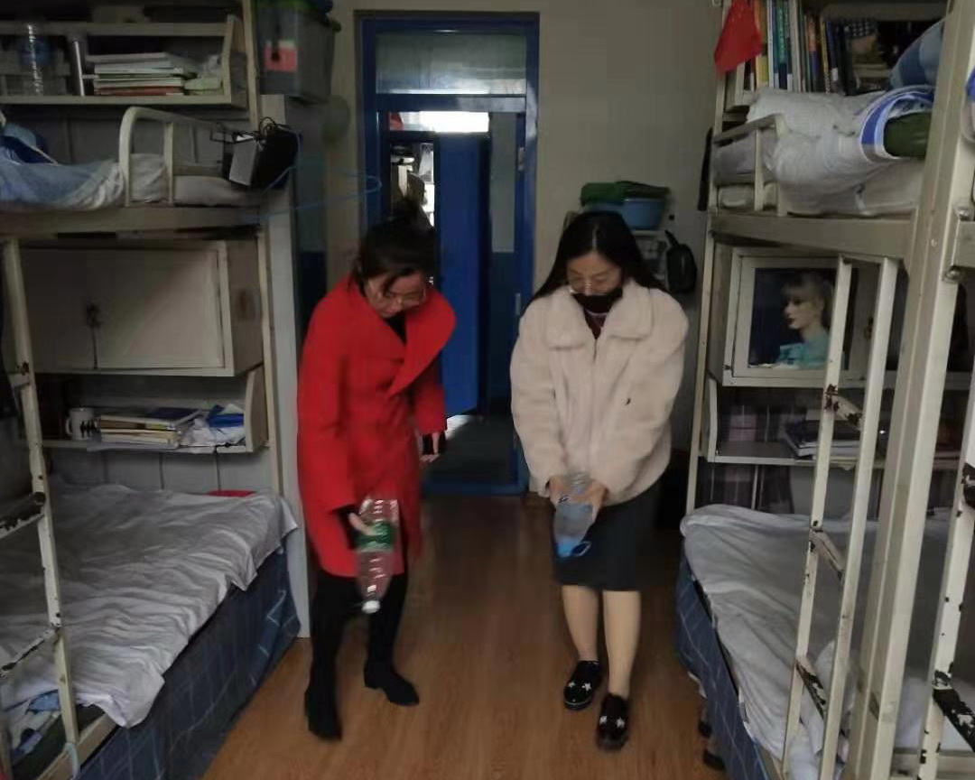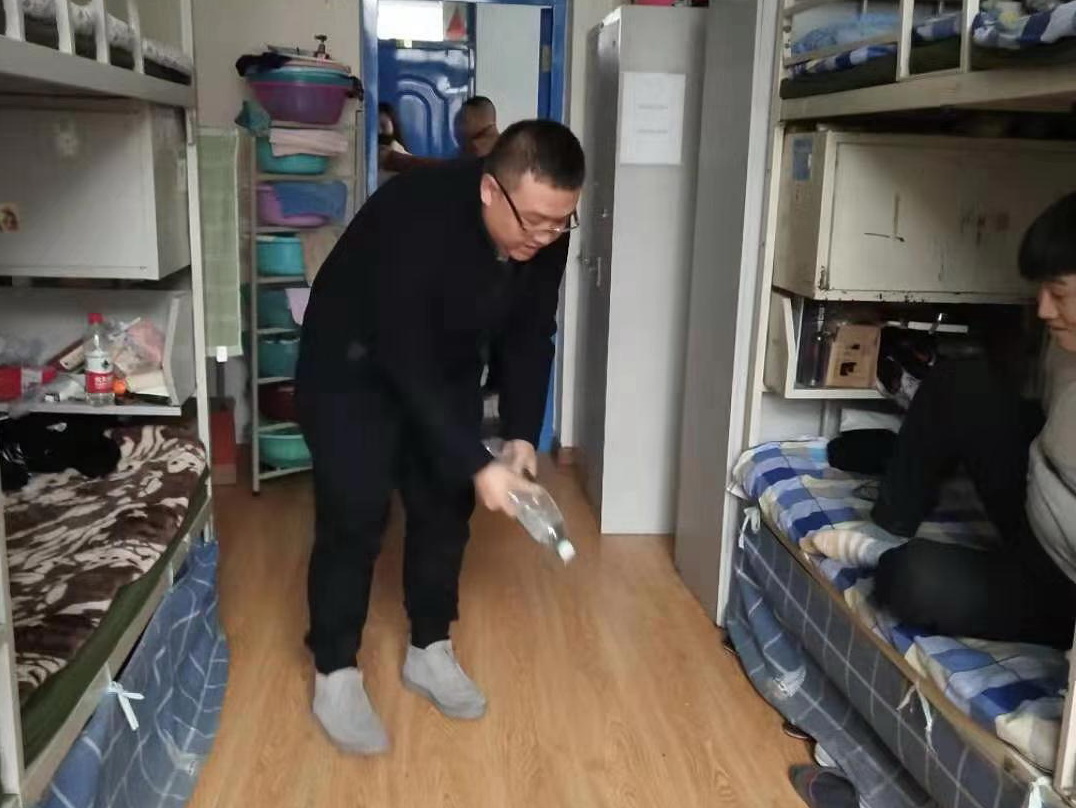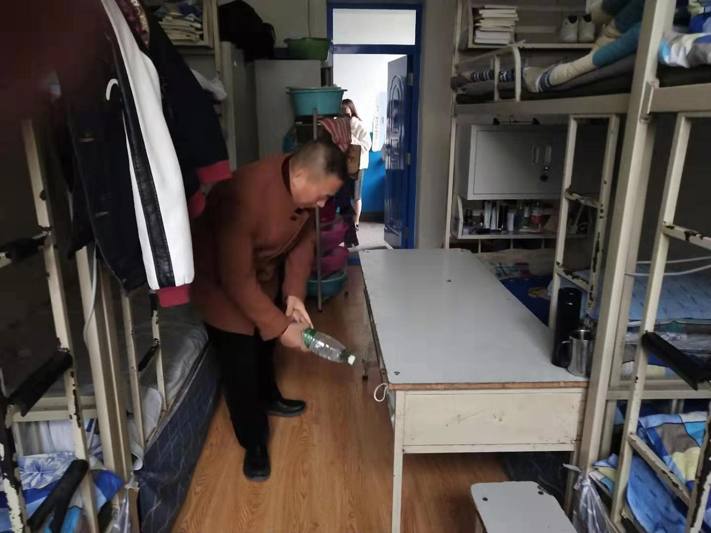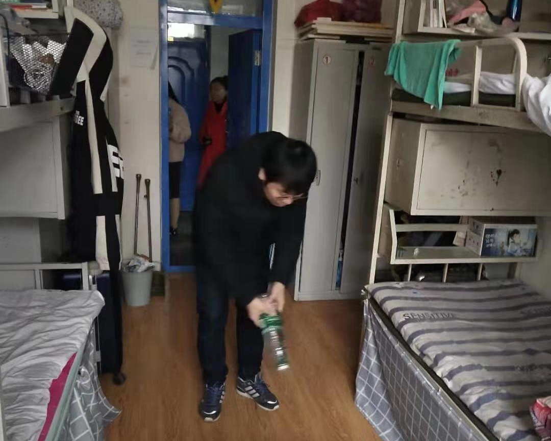 老师们先将消毒片用水稀释后,倒在喷壶里作为消毒用具。在分配好任务后,程刚书记指导第四支部的两组成员,严格按照规范流程,对所有宿舍进行了拉网式消毒,并对宿舍内的卫生死角进行了彻底清扫。同学们对此次消毒活动也都积极配合,主动帮助老师共同完成。消毒过后,同学们逐一打开宿舍门窗,做好最后的通风换气。
