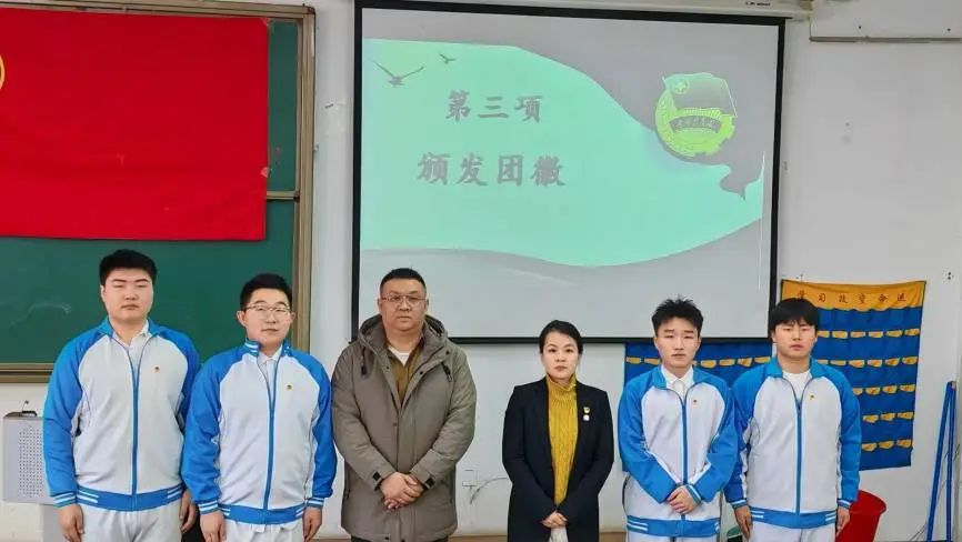 第三项:张钧铭老师、姜兆欣为新团员颁发团员证,并佩戴团徽