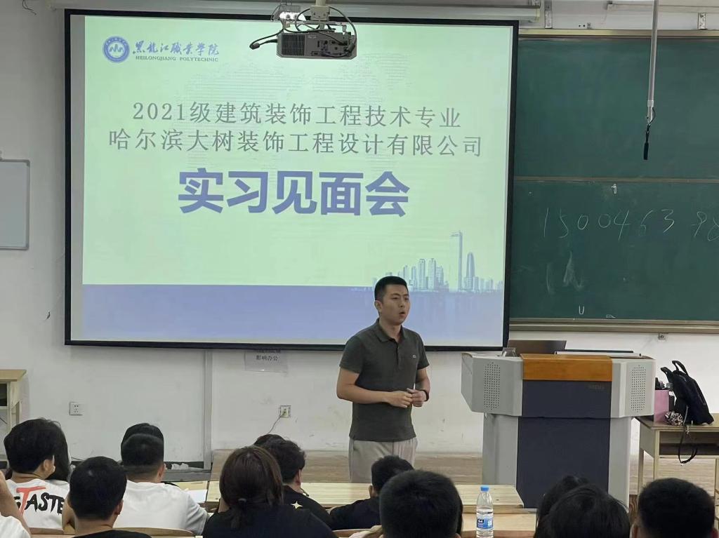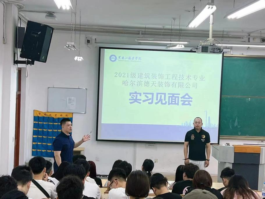 大会第二部分为企业见面会,由哈尔滨德天装饰有限公司周总经理,哈尔滨一楠品舍工程有限公司王总经理,哈尔滨大树装饰工程设计有限公司张经理。为同学们分析了行业发展现状,介绍了公司对实习生的培养方案,包括专业培训、项目锻炼、岗位培养、团队拓展等一系列内容。