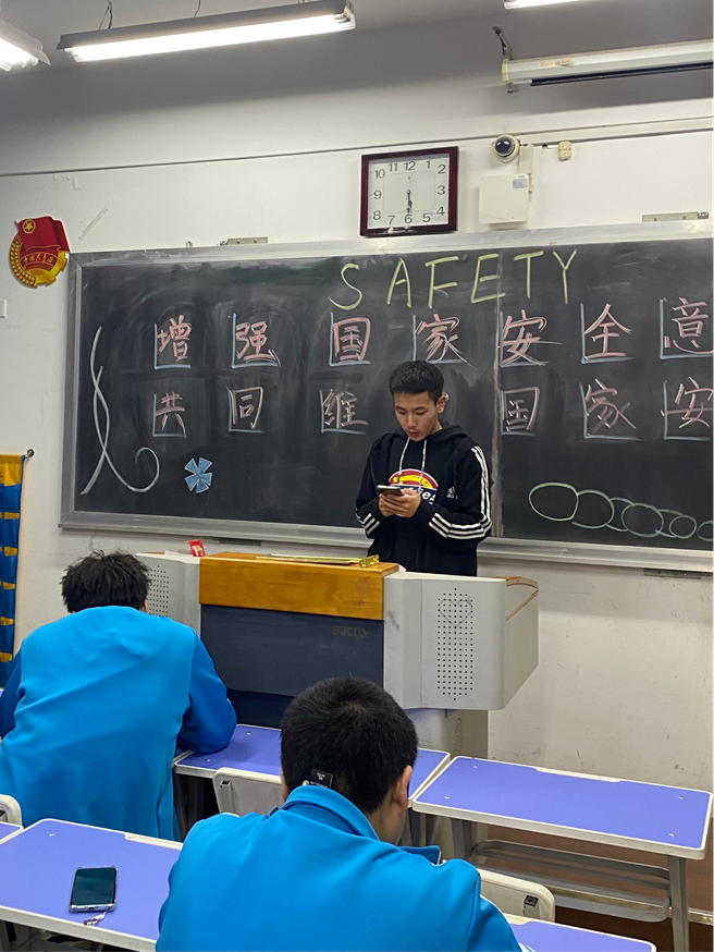学生们在班会中感悟,在感悟中成长。各小组从国家,政治,经济,文化,国土,网络,资源等方面展开了讨论,国家安全,国泰民安,是我们奋力前行的坚强后盾!无论以后从事什么工作,都要以国家人民的利益为重。最后,在班长的倡议下同学全体起立,大声宣誓,国家安全,人人有责,增强国家安全意识,共同维护国家安全!