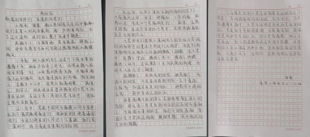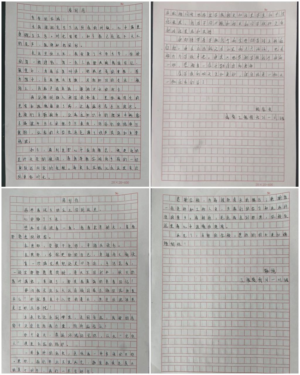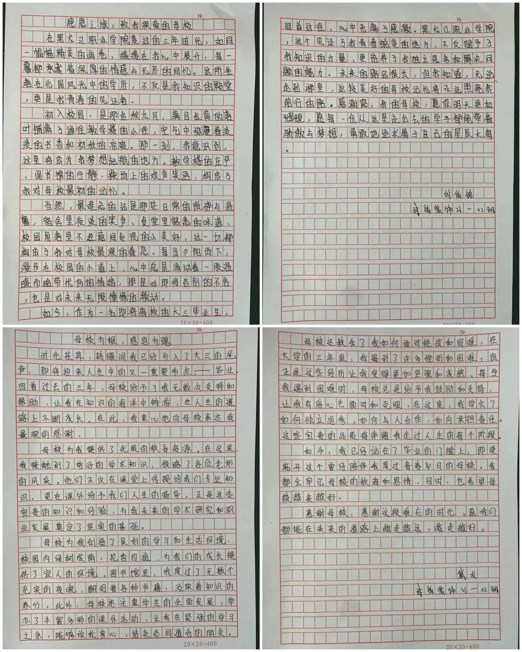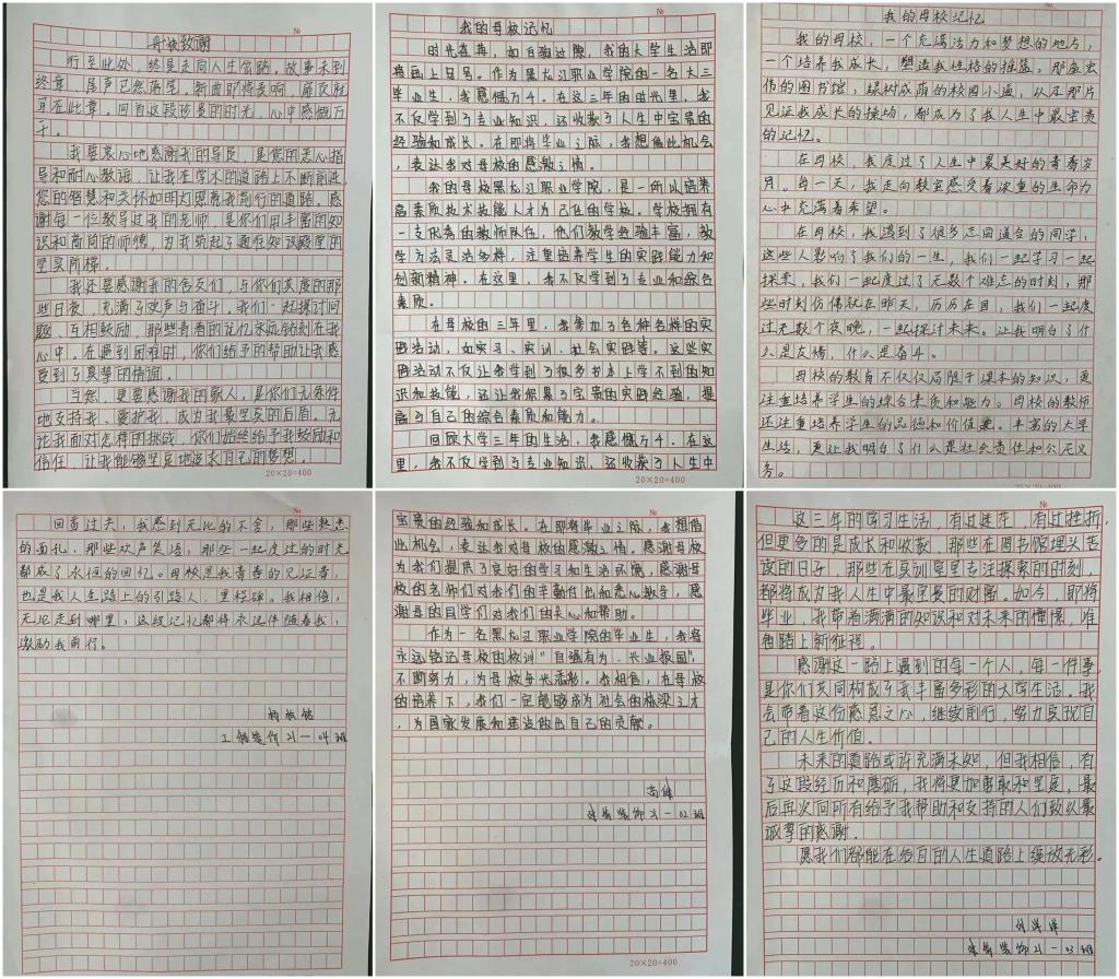 毕业生们积极响应书信赠言活动,他们饱含留恋与不舍,把对母校的赞美、师恩的感激、青春的忆记、人生的感悟、未来的憧憬诉诸笔端,抒发着自己不尽的思念。