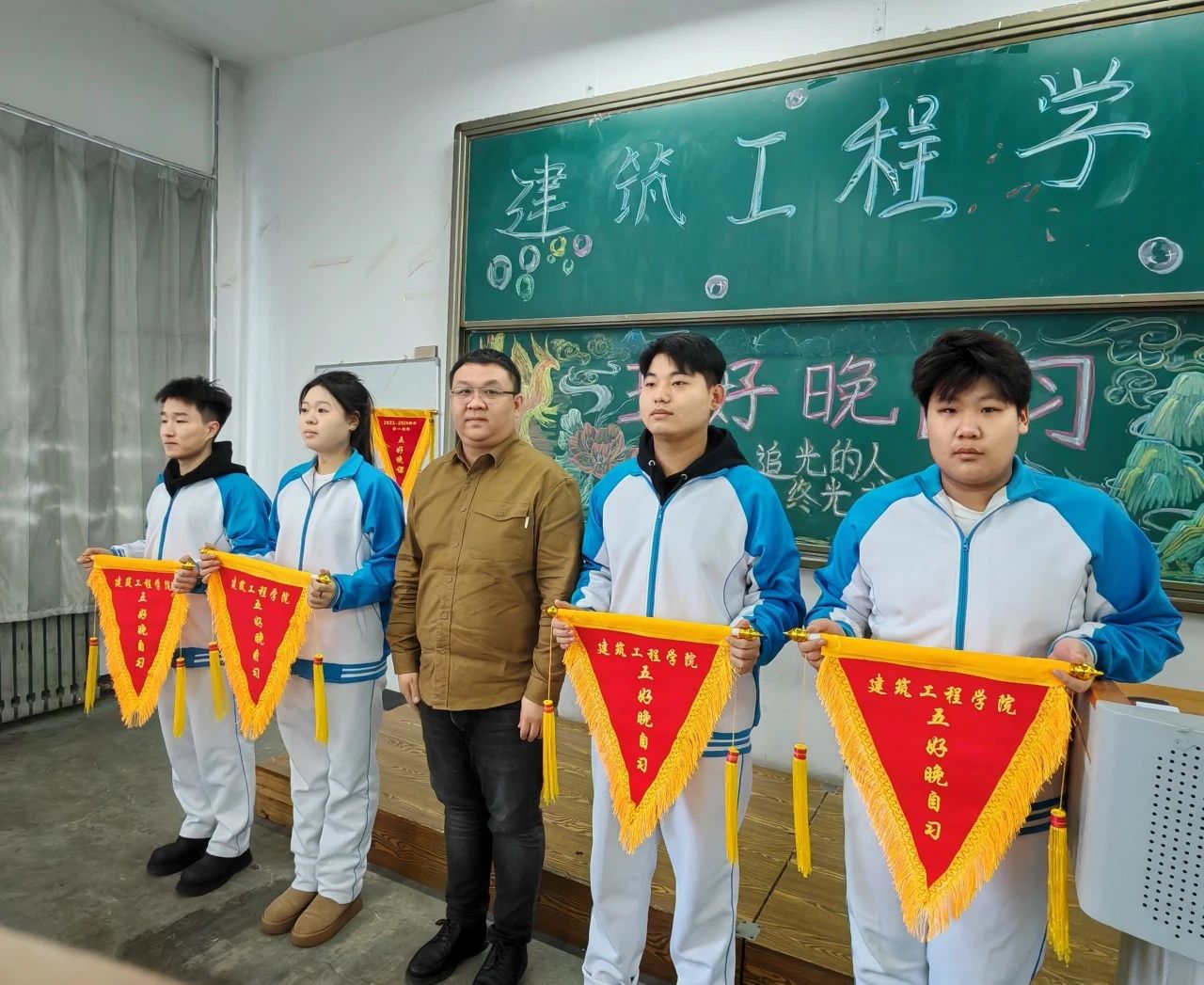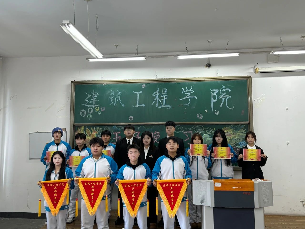 活动伊始,学院学生会主席孙琪锋、学生服务中心主任赵凤艳分别宣读表彰决定,本次共有4个班级荣获“五好晚自习”称号,6个班级荣获“文明班级”称号。在热烈的掌声中,获奖班级代表依次上台领奖,学管办主任张钧铭为他们颁发荣誉锦旗,并合影留念。五好晚自习获得班级: 工程造价24-04班 室内设计24-02班 建筑装饰24-03班 建筑装饰24-01班 文明班级获得班级: 工程造价24-01班 工程造价24-05班 建筑装饰24-01班 建筑装饰24-04班 建筑工程技术24-02班 室内设计24-02班